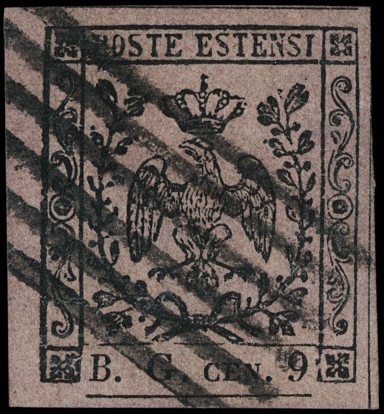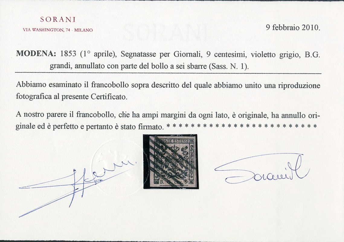 1853 - Segnatasse per giornali 9c violetto grigio 'B.G.' grande, BdF, annullato con bollo a sei sbarre. CF Sorani (Sassone SG1 - Euro 5.500)