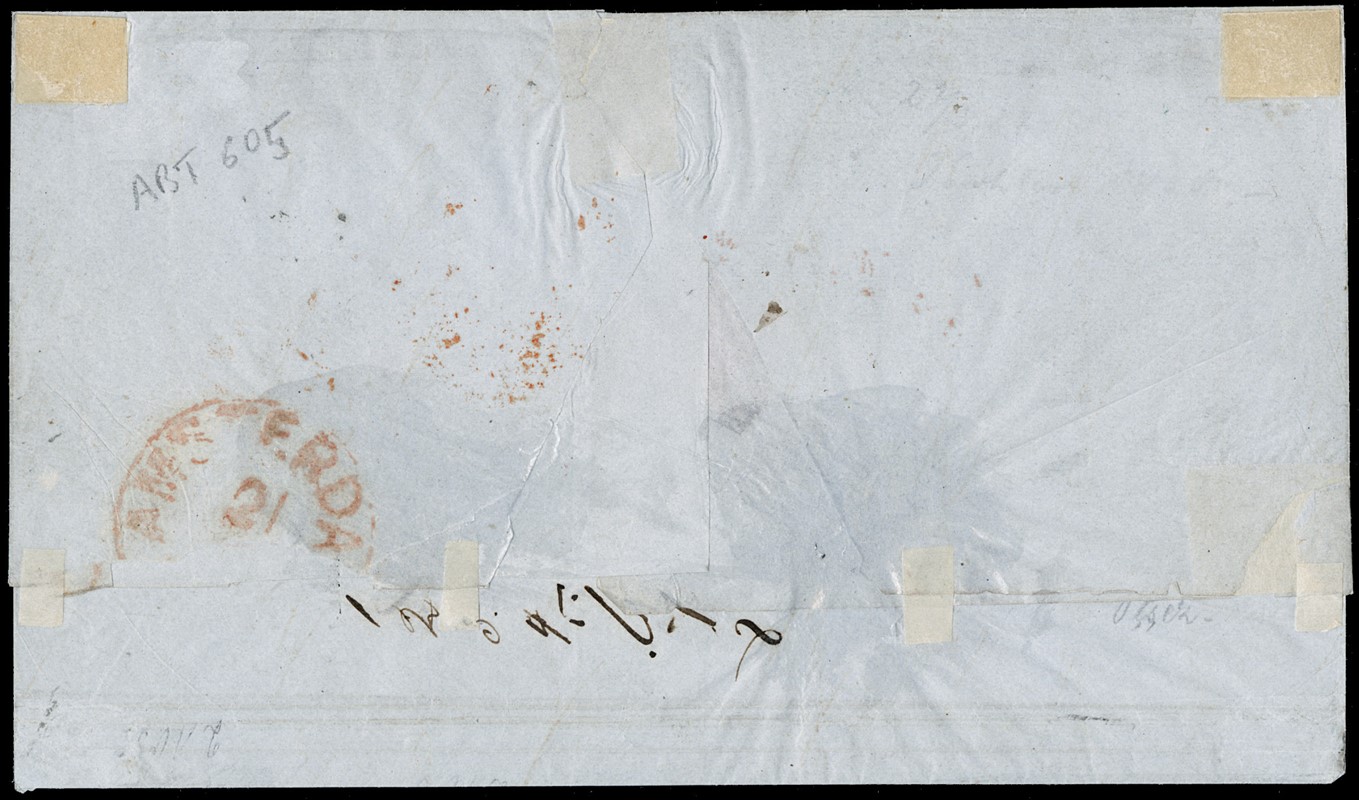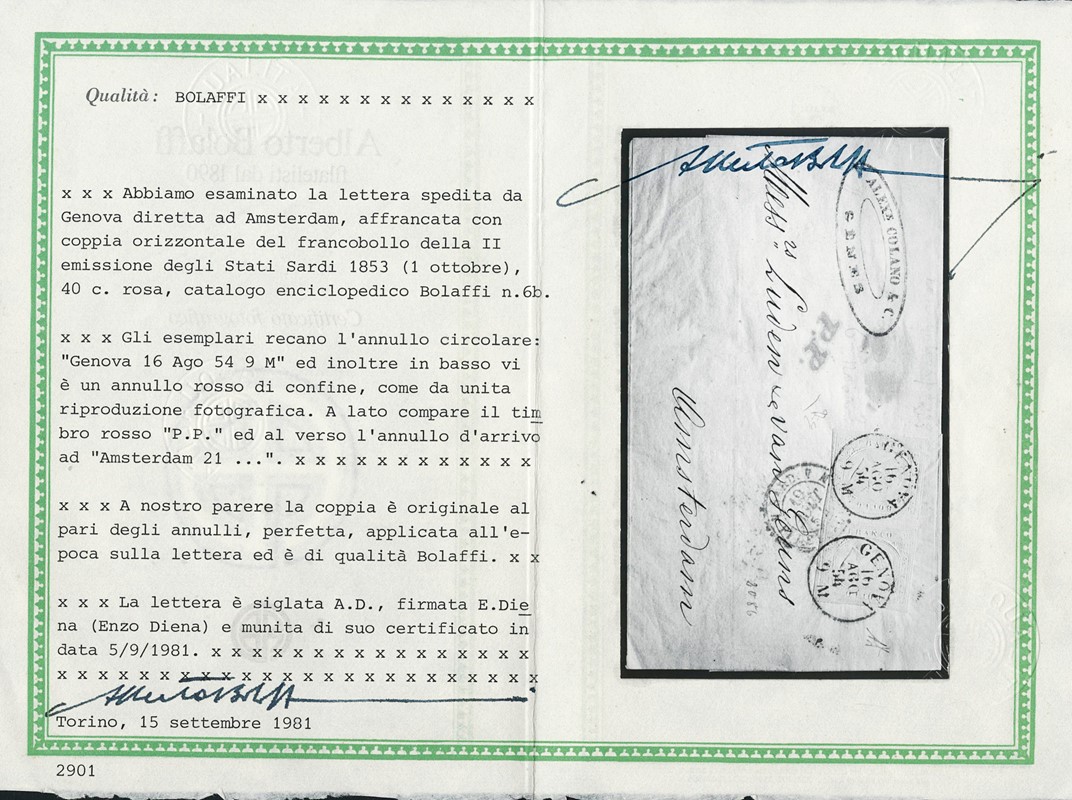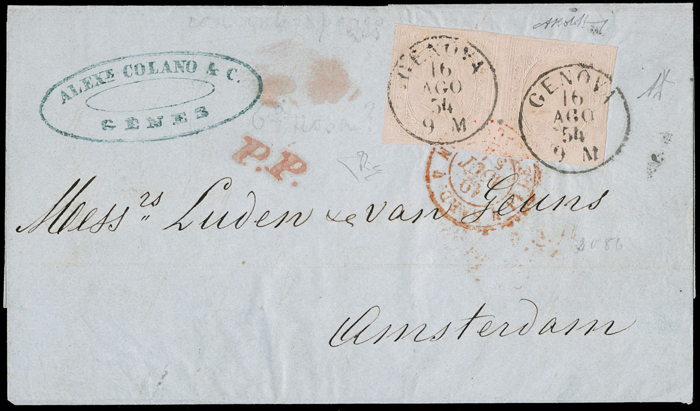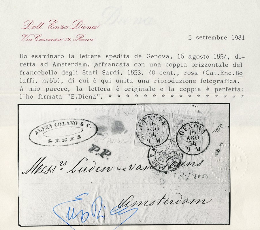 1854 - Sardegna, I emissione 40c rosa chiaro, coppia orizzontale da 'GENOVA 16 AGO 54' ad Amsterdam. Splendida. Sigla A.Diena, CF E.Diena e Bolaffi (Sassone 6 - Euro 18.000)
