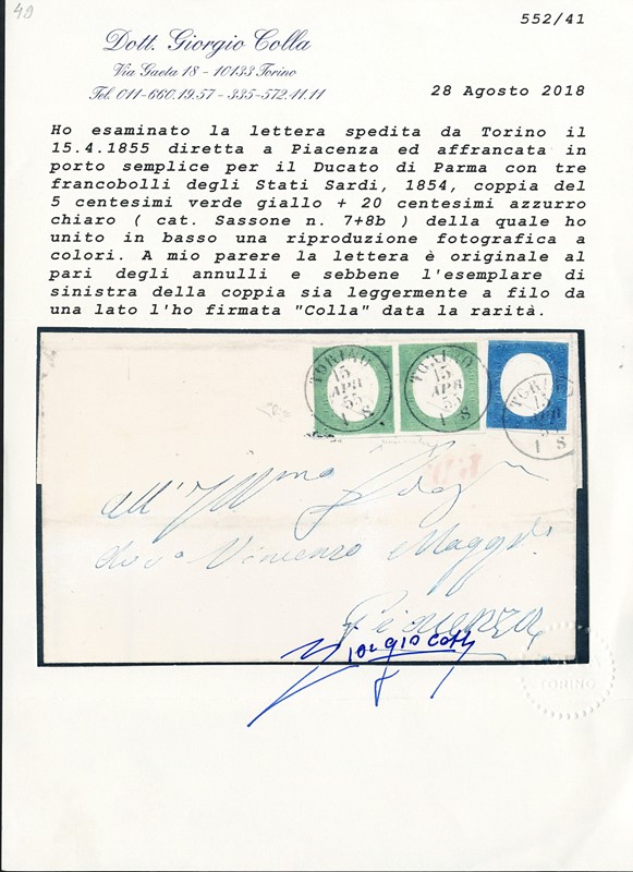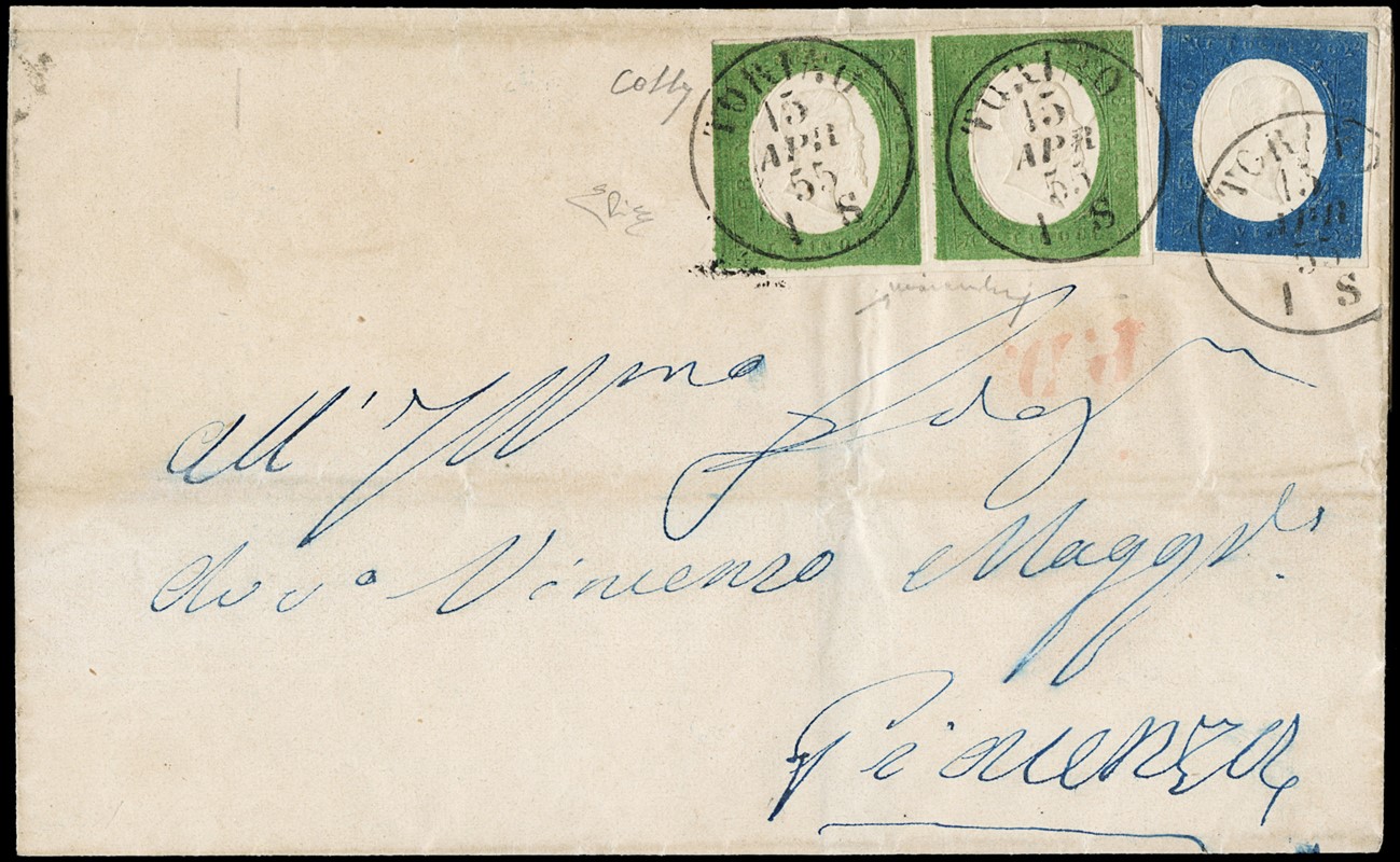 1854 - Sardegna, III emissione, 5c verde giallo, coppia orizzontale (a filo a sinistra), e 20c azzurro chiaro (a filo in alto) da 'TORINO 15 APR 55' a Piacenza (Ducato di Parma). Rara affrancatura bicolore. Firme E.Diena e Chiavarello, CF Colla (Sassone 7+8b - Euro 28.000+)