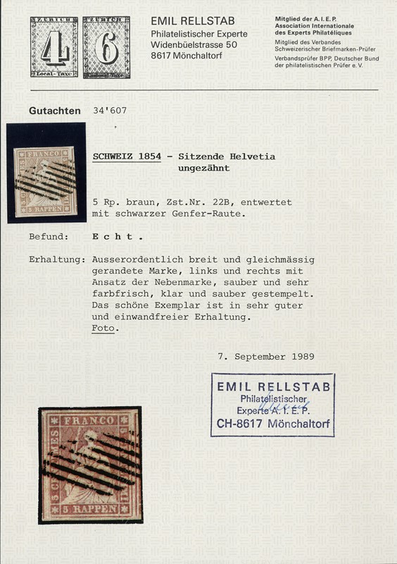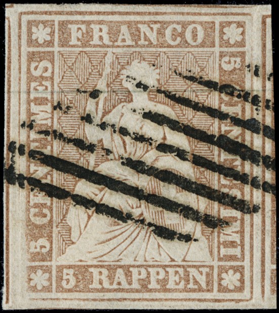 1854 - Strubel, 5rp marrone, carta media, annullato con bollo a griglia di Ginevra. Esemplare eccezionalmente marginato, CF Rellstab (Zumstein 22B - CHF 200++)