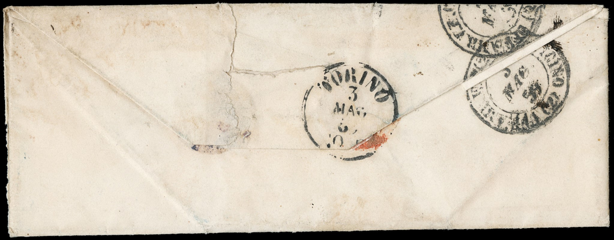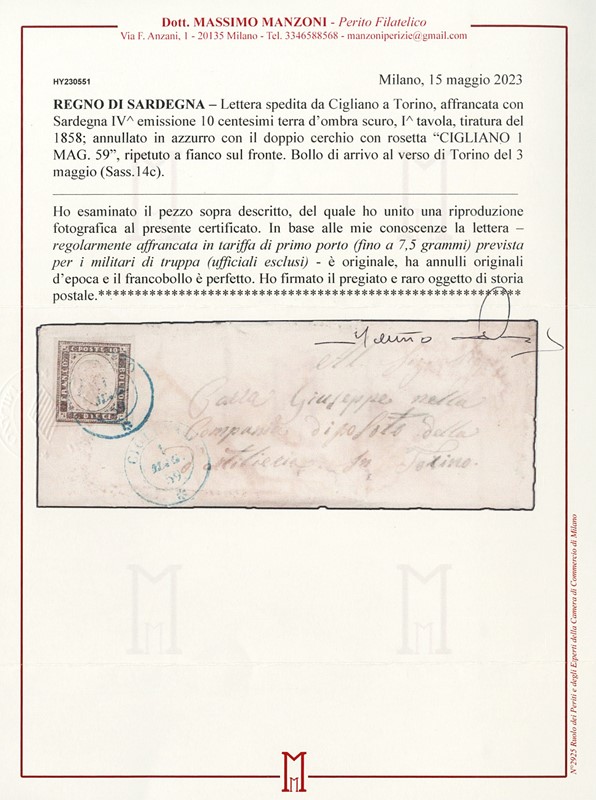1855 - 10c terra d'ombra scuro, I tav. tir.'58, da 'CIGLIANO 1 MAG 59' (azzurro) a Torino, in tariffa ridotta per militari. Rara, CF Manzoni (Sassone 14c+pt.4 - Euro 10.800+)