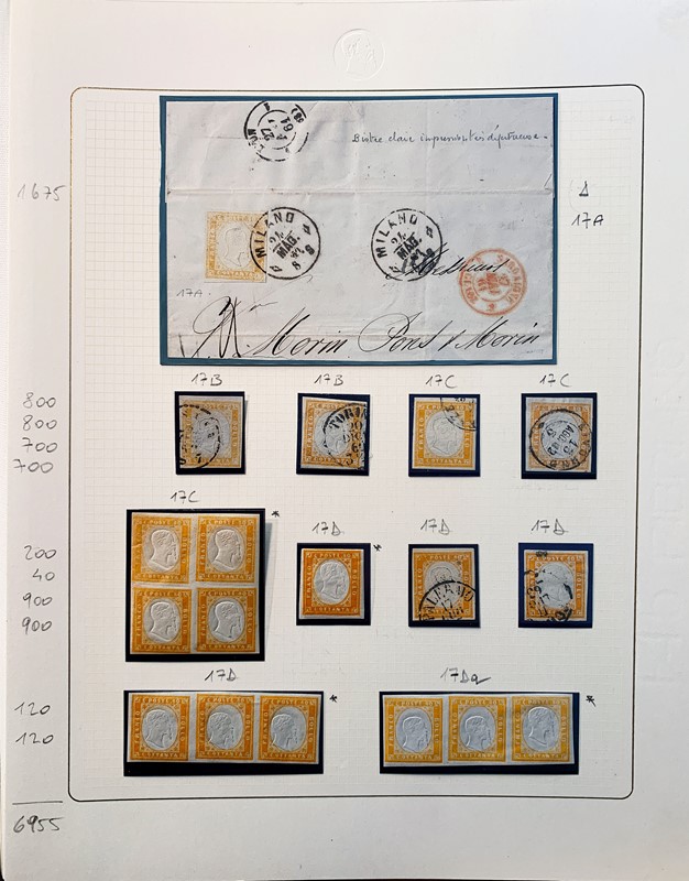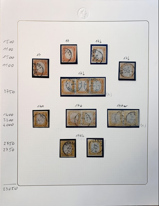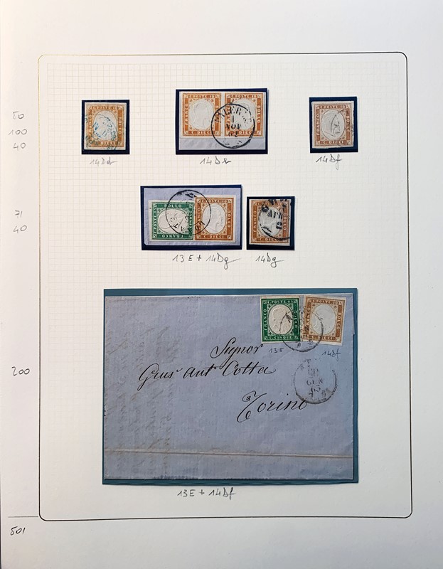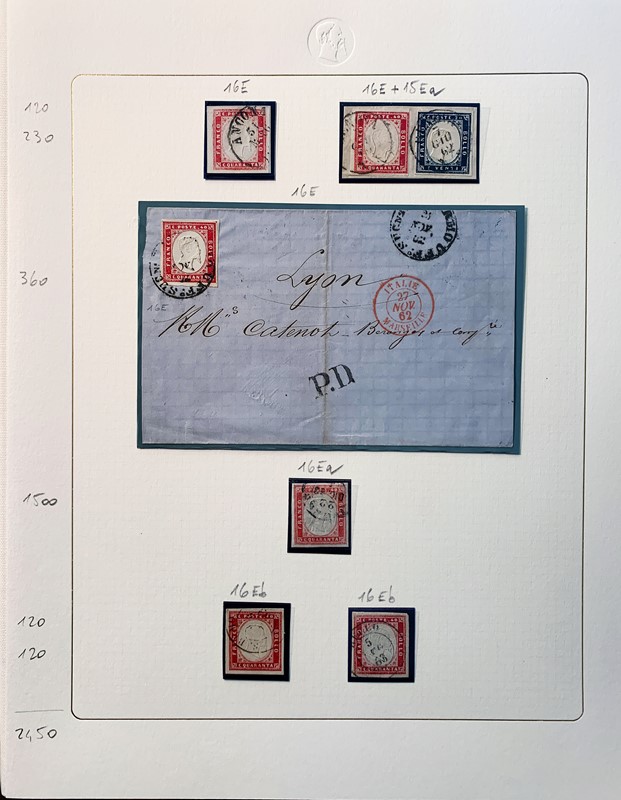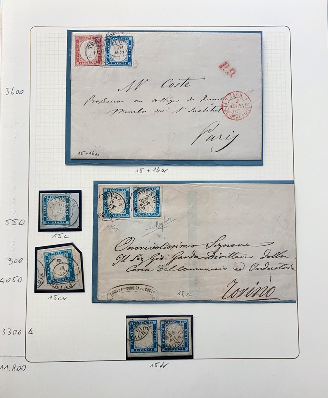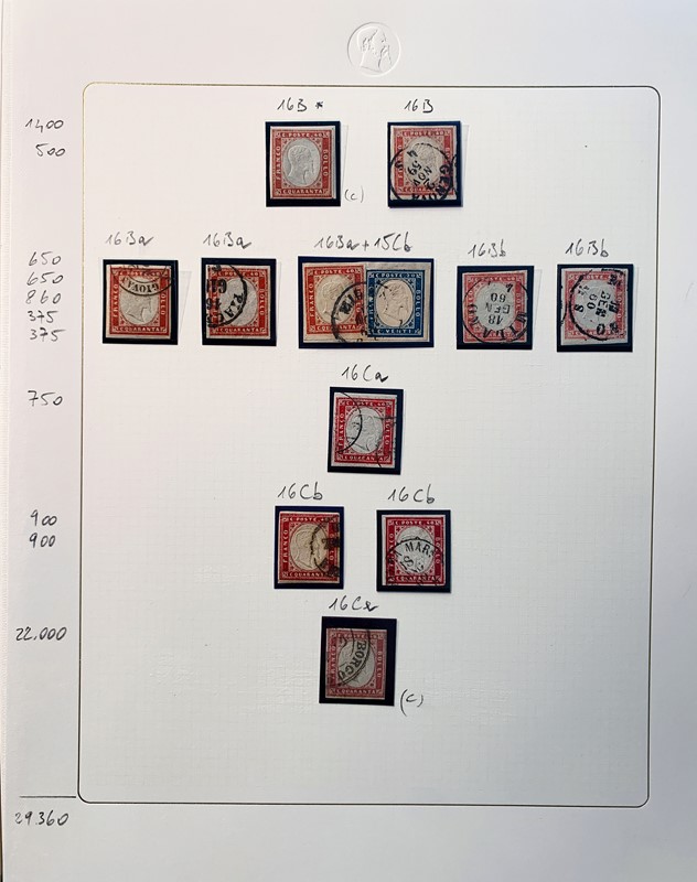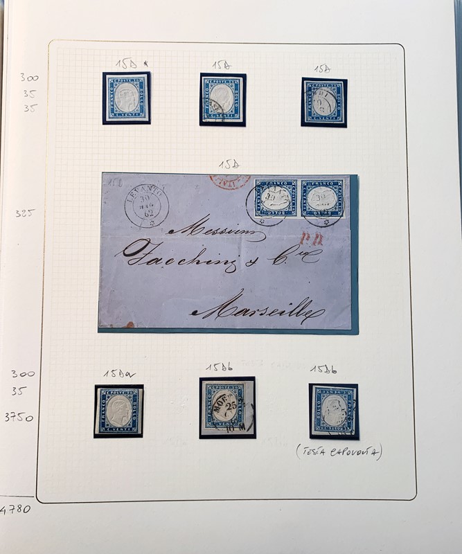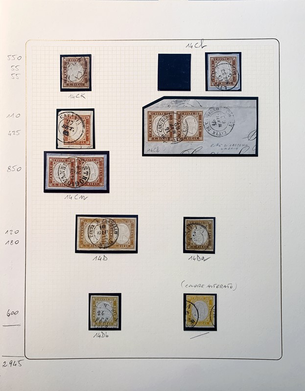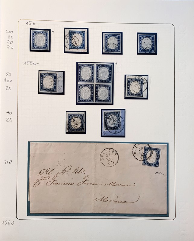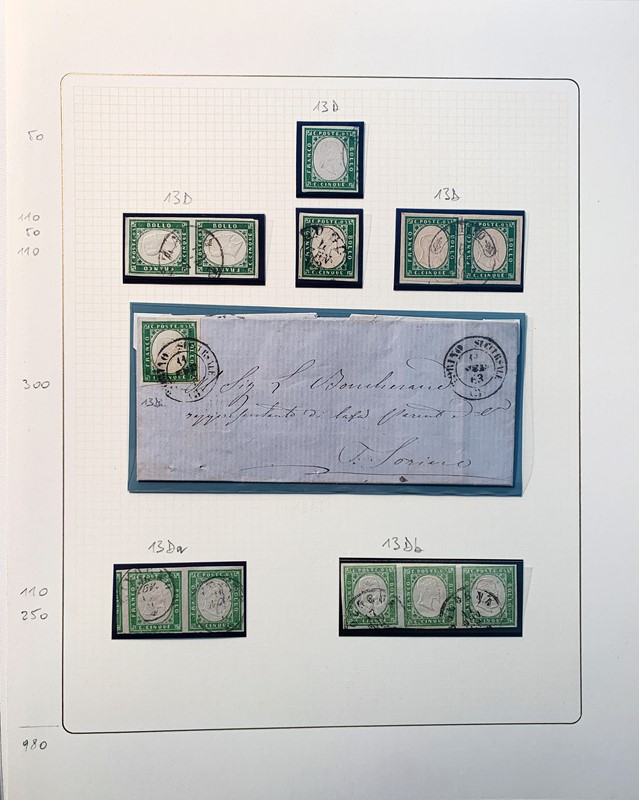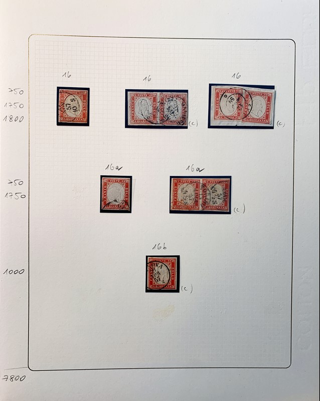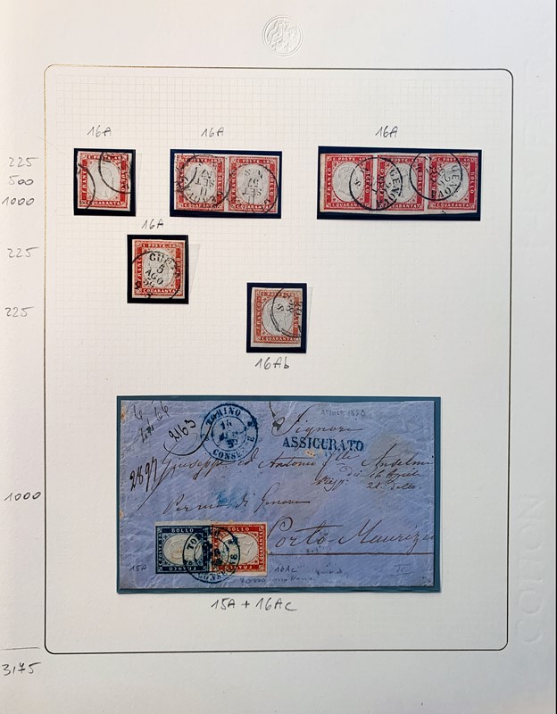 1855/61 - SARDEGNA: avanzatissima collezione dei colori della IV emissione, composta da francobolli nuovi, usati e su lettera. Sono presenti molti colori rari, alcune strisce, blocchi e affrancature. Elevatissimo valore di catalogo, 35 CF. Irripetibile in