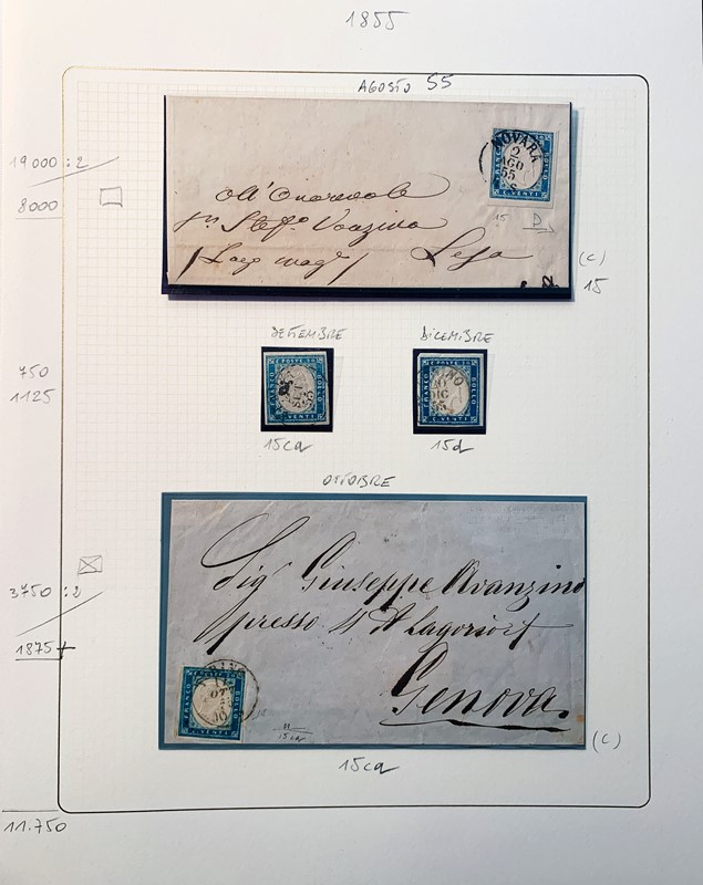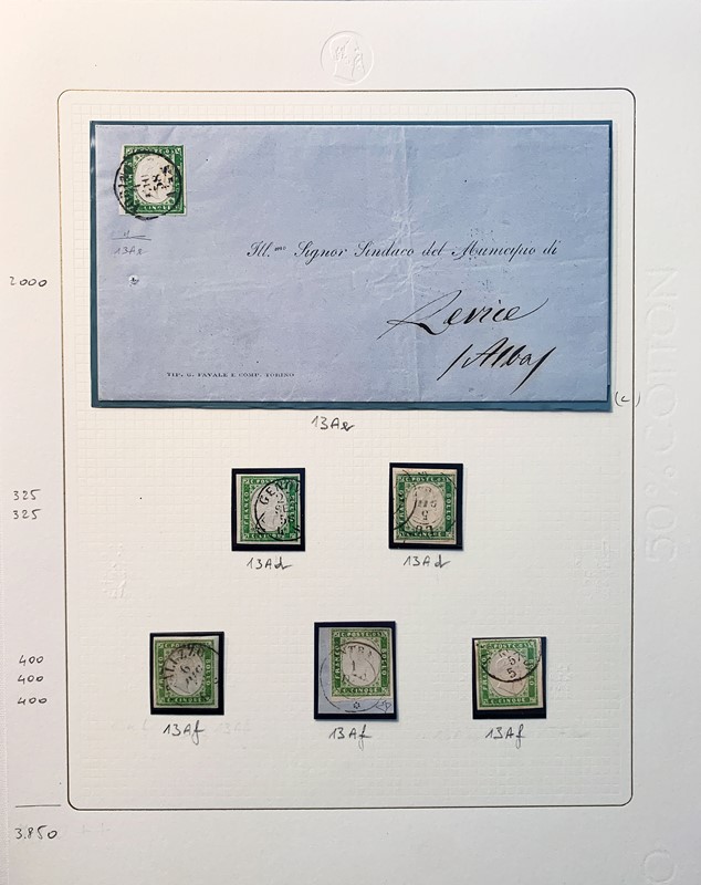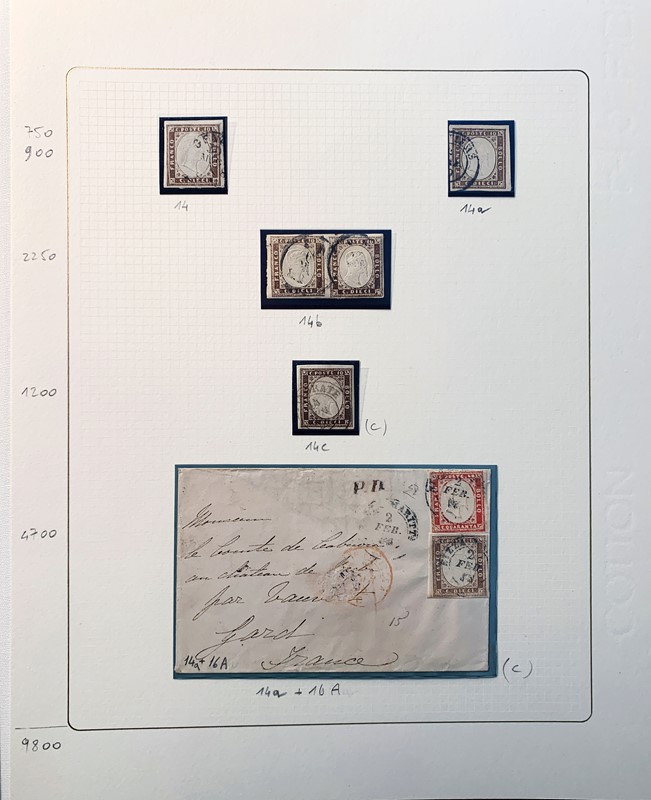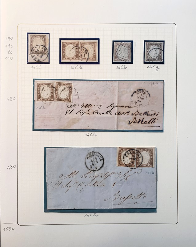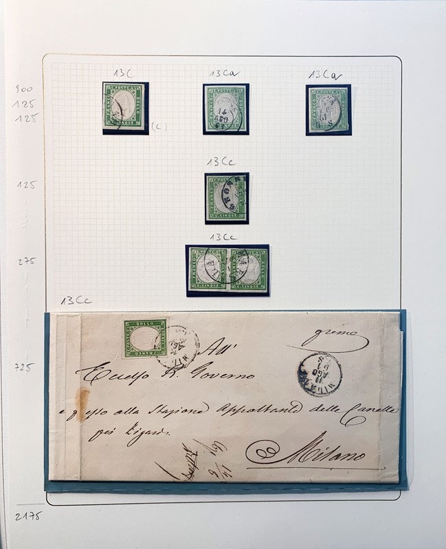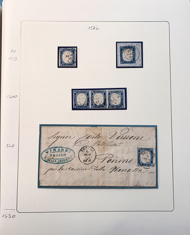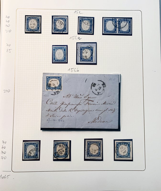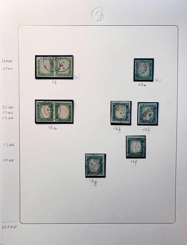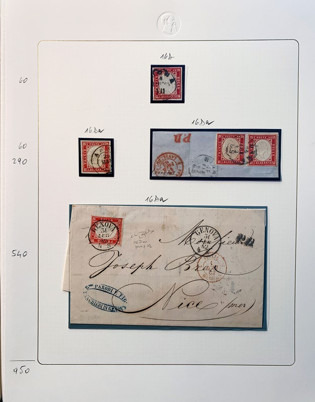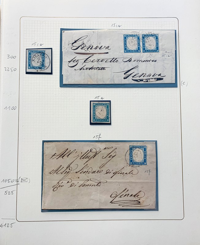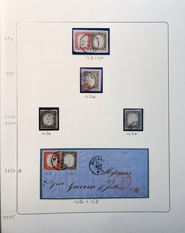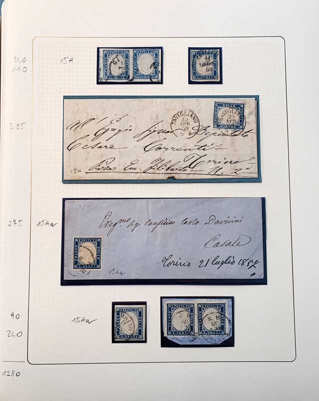 1855/61 - SARDEGNA: avanzatissima collezione dei colori della IV emissione, composta da francobolli nuovi, usati e su lettera. Sono presenti molti colori rari, alcune strisce, blocchi e affrancature. Elevatissimo valore di catalogo, 35 CF. Irripetibile in