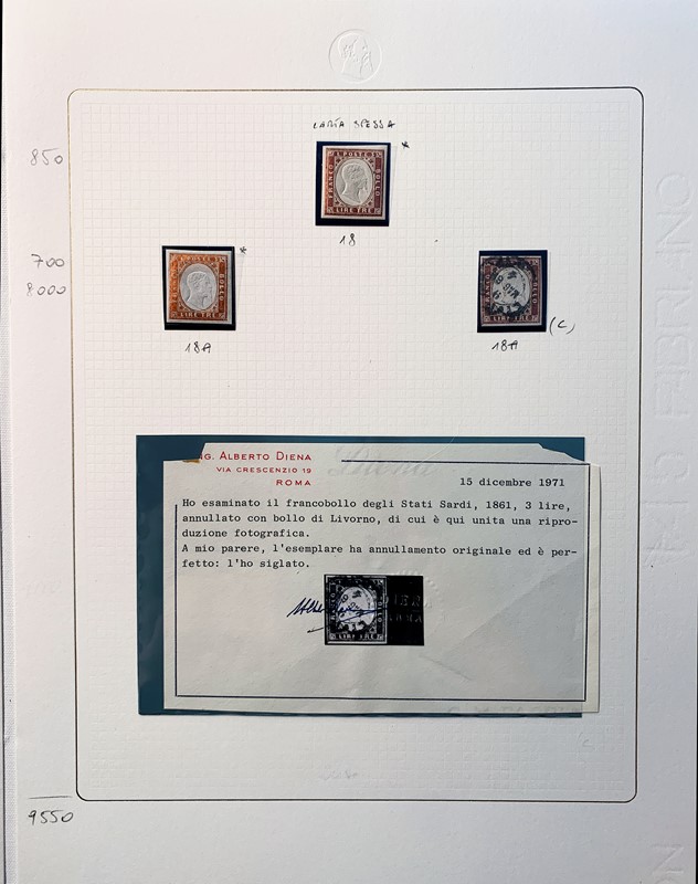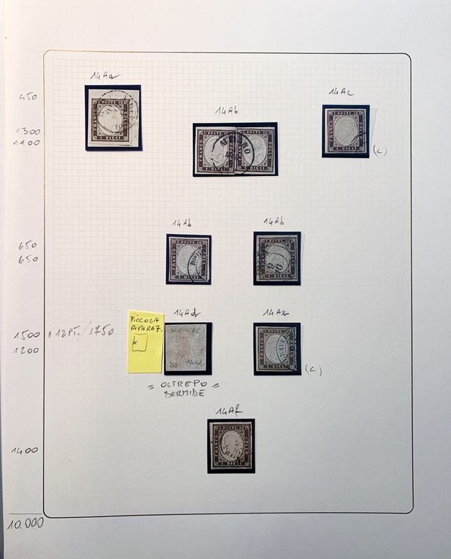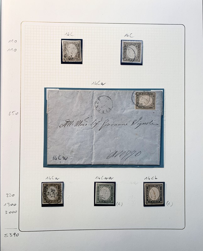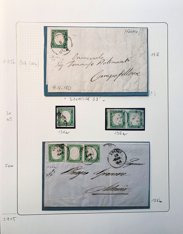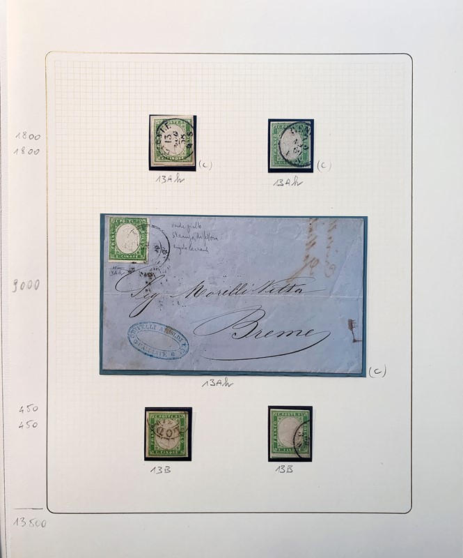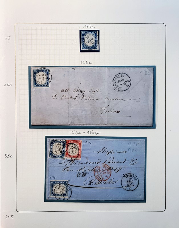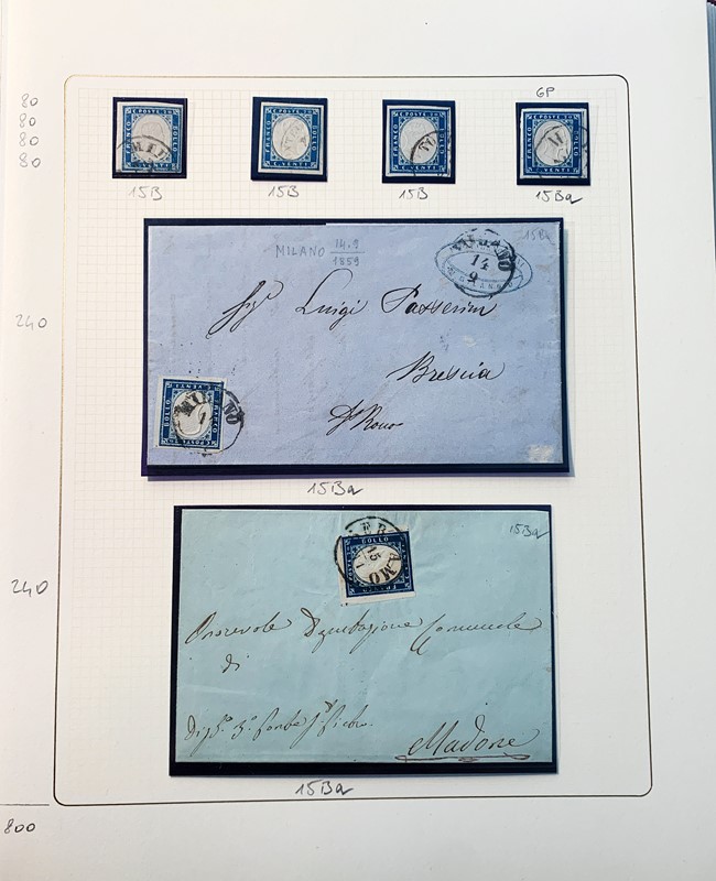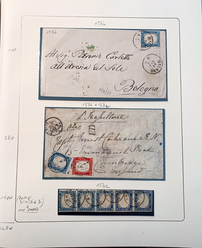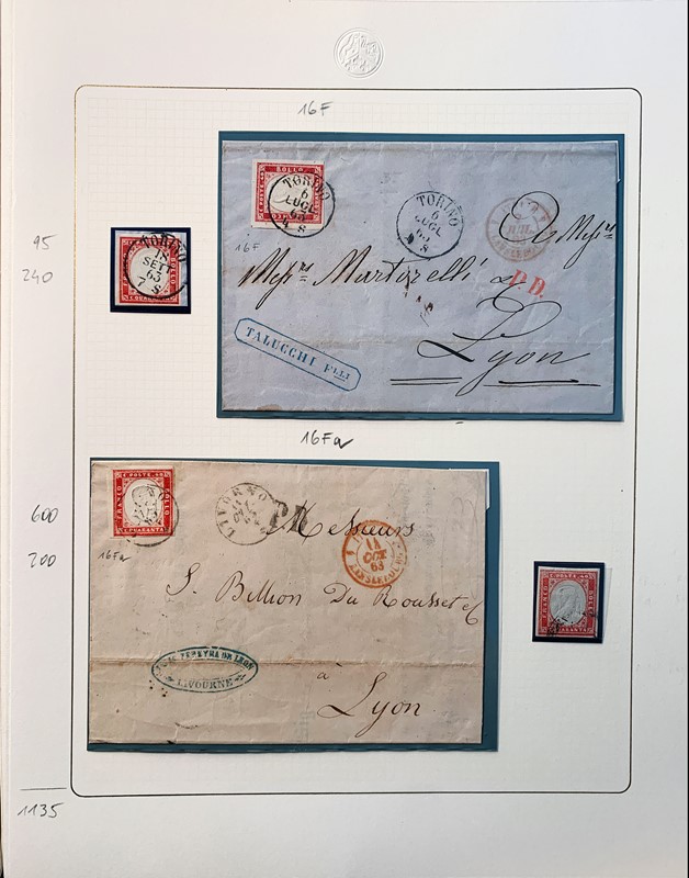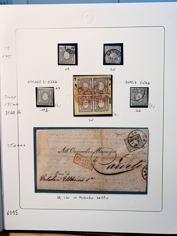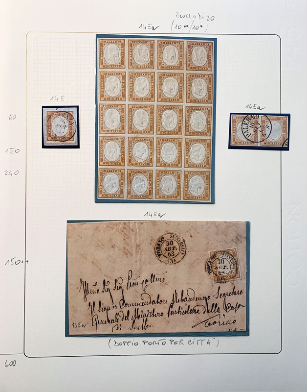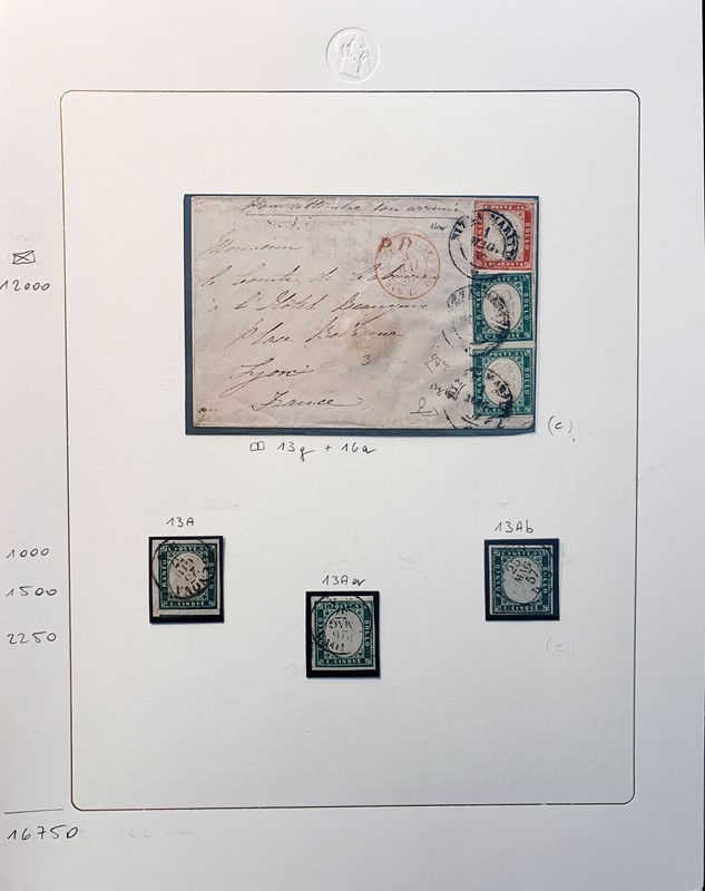 1855/61 - SARDEGNA: avanzatissima collezione dei colori della IV emissione, composta da francobolli nuovi, usati e su lettera. Sono presenti molti colori rari, alcune strisce, blocchi e affrancature. Elevatissimo valore di catalogo, 35 CF. Irripetibile in