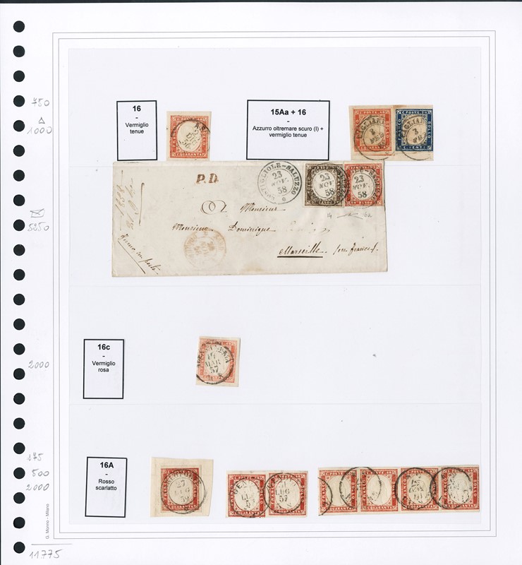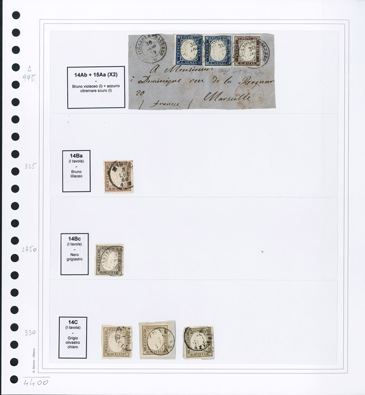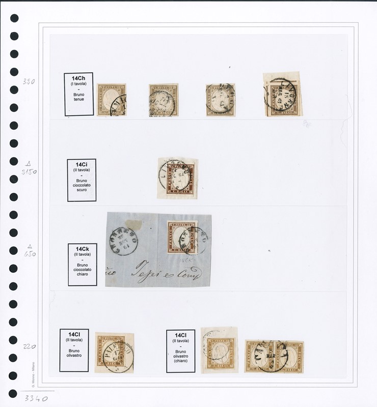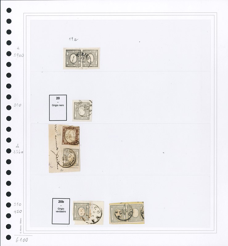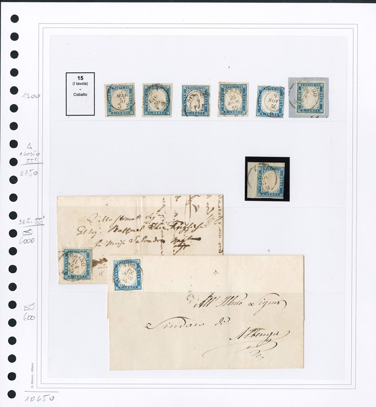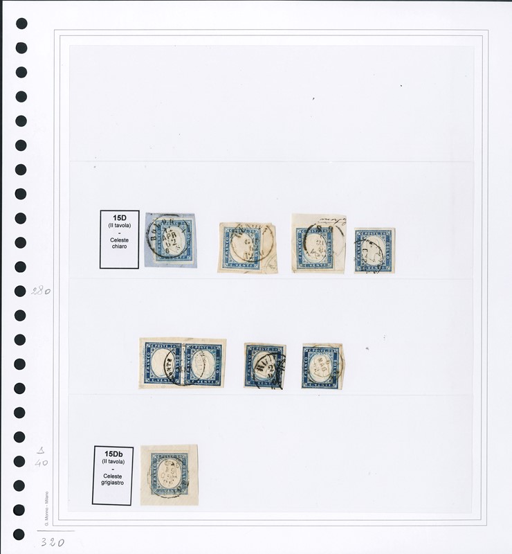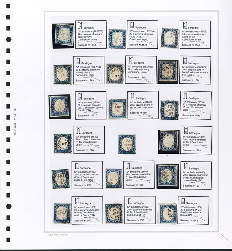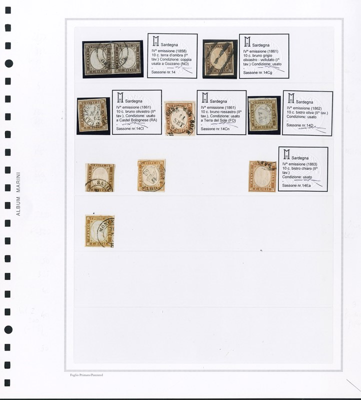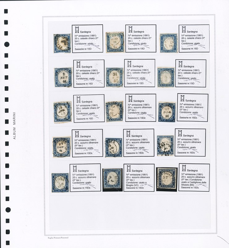 1855/61 - SARDEGNA: classificatore con collezione della IV emissione, composta da francobolli usati, su frammento e su lettera. Presenti numerosi esemplari pregiati e rari. Qualita' mista, in genere ottima. Altissimo valore di catalogo. 23 CF (Sassone Eur