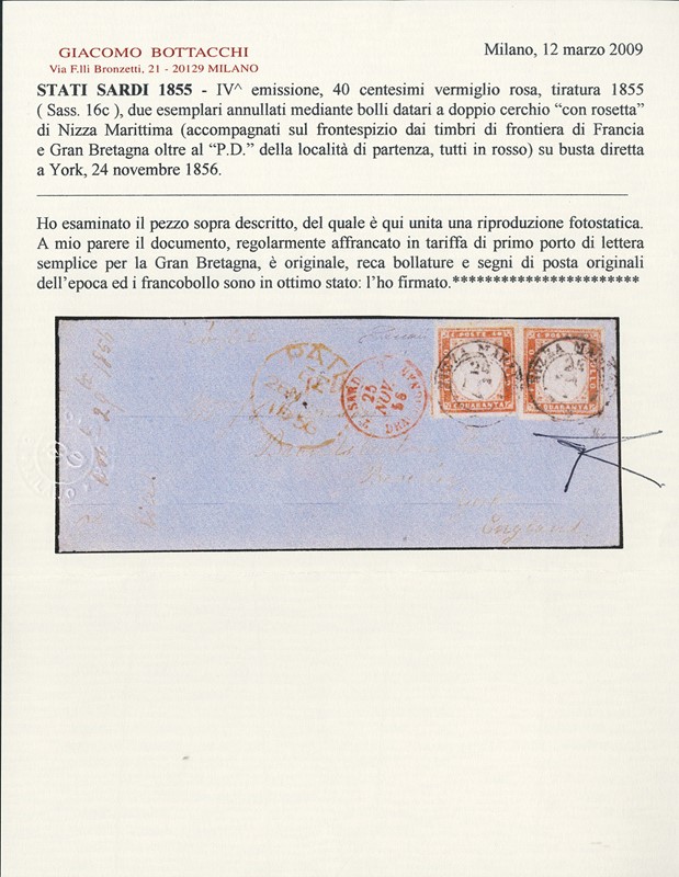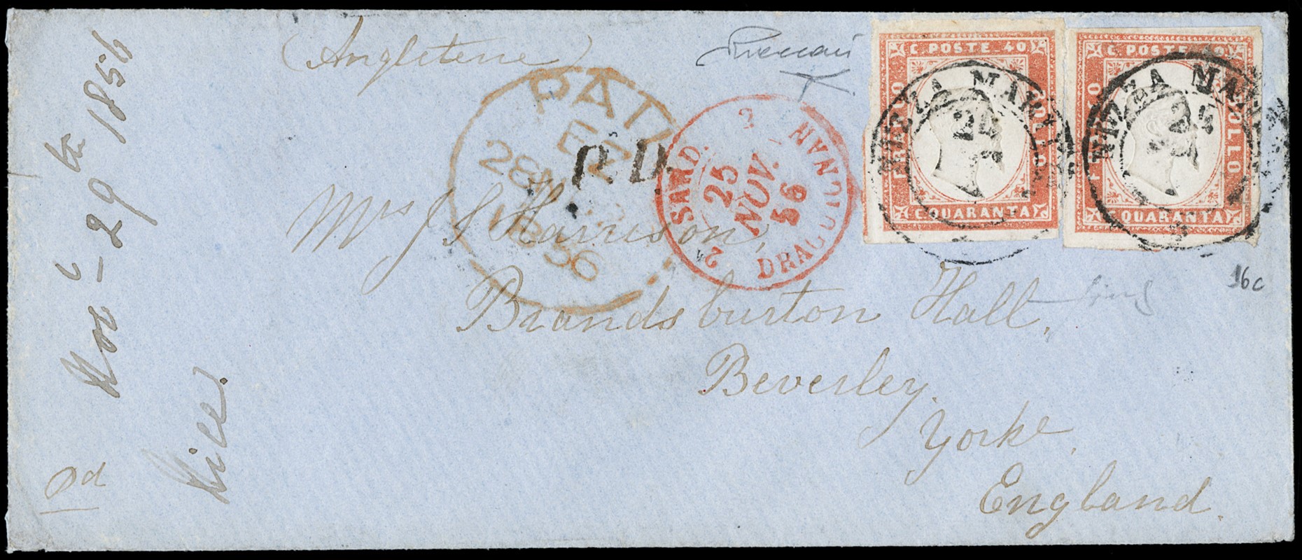 1856 - Sardegna, IV emissione, 40c vermiglio rosa, tir.'55, due esemplari ben marginati da 'NIZZA MARITTIMA 24 NOV 56' a York (Inghilterra). Sigla Vaccari, CF Bottacchi (Sassone 16c - Euro 16.000)