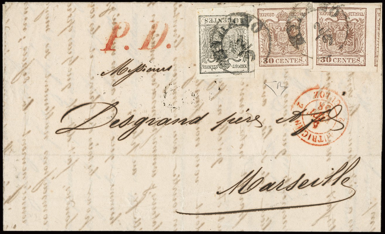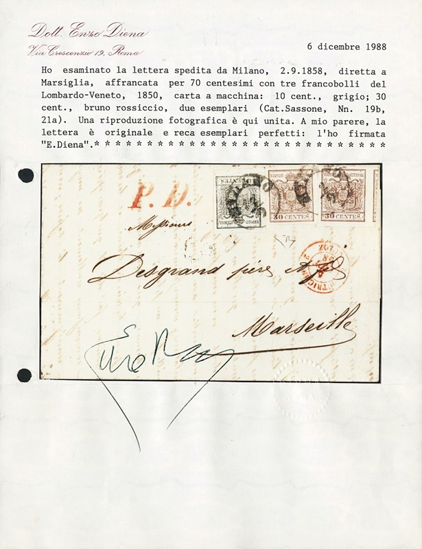 1857 - 10c grigio carta a macchina e 30c bruno rossiccio, due esemplari, da 'MILANO 2/9' (1858) a Marsiglia. CF E.Diena (Sassone 19b+21a - Euro 27.950++)