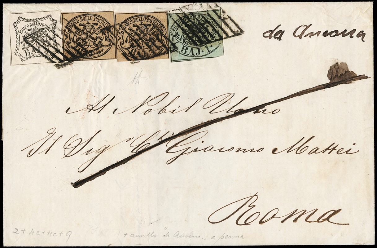 1857 - 1b verde grigiastro, 3b camoscio, due esemplari, e 8b bianco, affrancatura da 15b 'da Ancona' (manoscritto a penna sul fronte) a Roma. Inedito annullamento grafico. Sigla A.Diena (Sassone 2+4c+9 - Euro -)