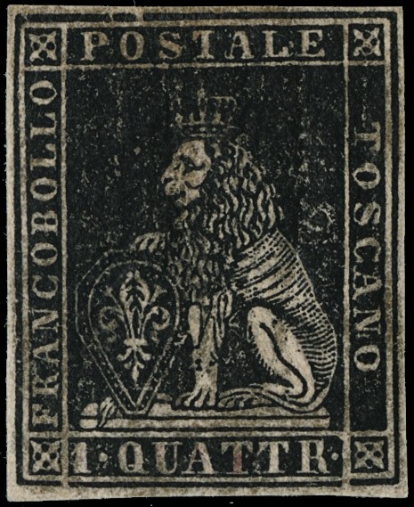1857 - 1q nero, con margini bianchi regolari su tutti e quattro i suoi lati, nuovo con gomma. Sigla Bottacchi (Sassone 10 - Euro 4.000)