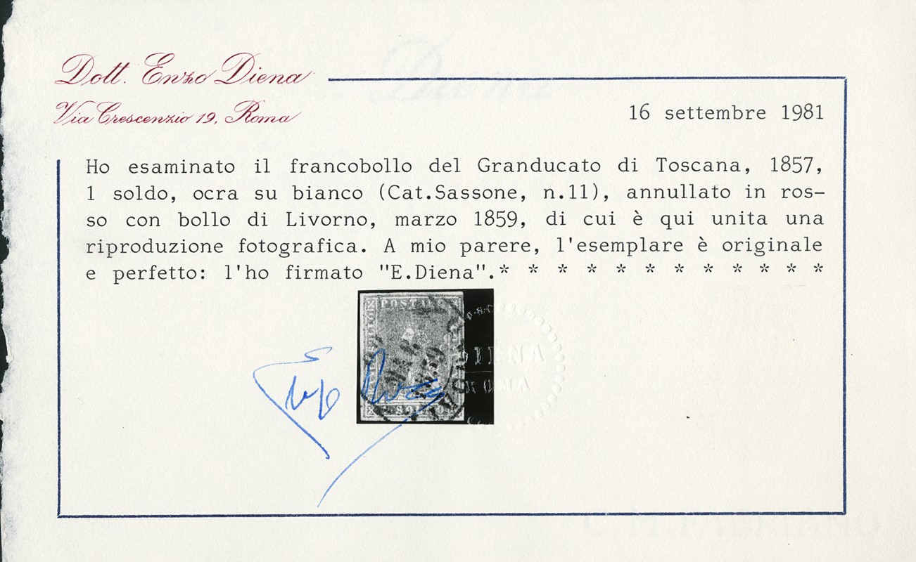 1857 - 1s ocra con margini bianchi e annullo rosso di Livorno. Timbrino Fulpius, CF E.Diena (Sassone 11 - Euro 12.000)