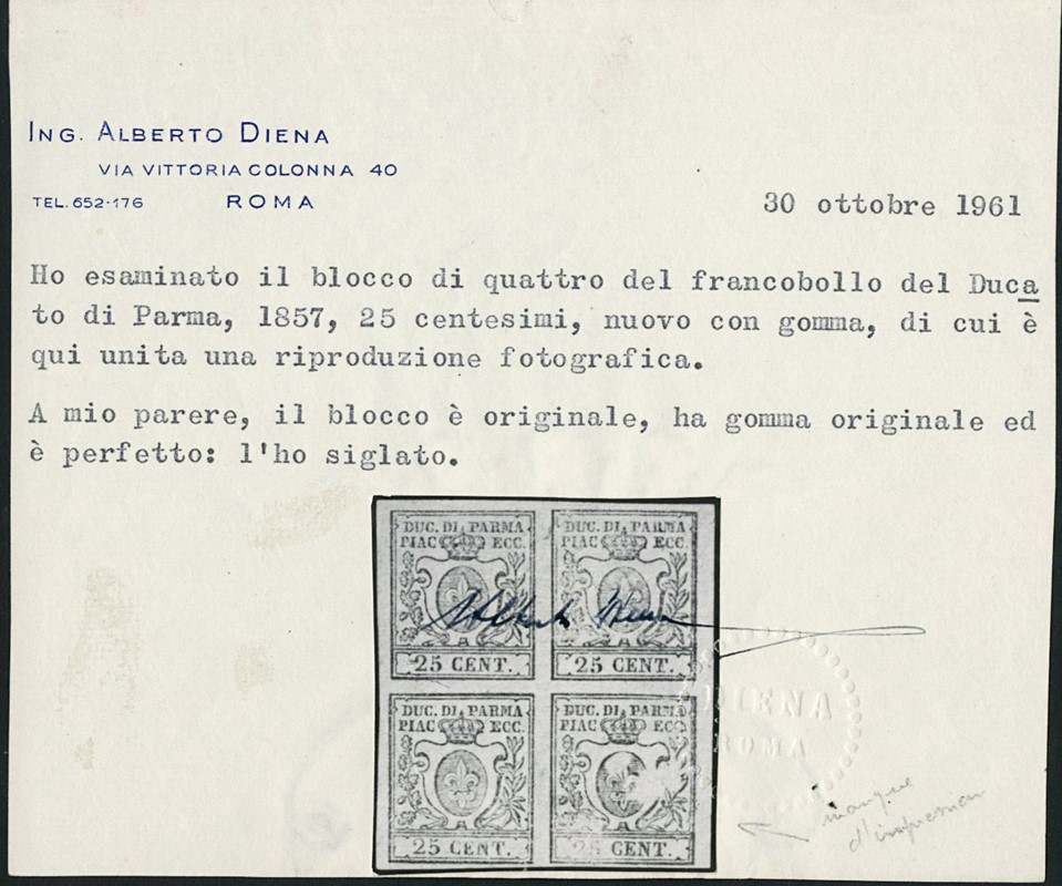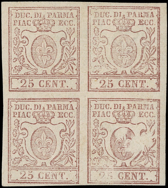 1857 - 25c bruno lilla, BL4, i due esemplari inferiori SL e con vistosa falla di stampa sull'esemplare inferiore destro. CF A.Diena (Sassone 10 - Euro 10.000+)