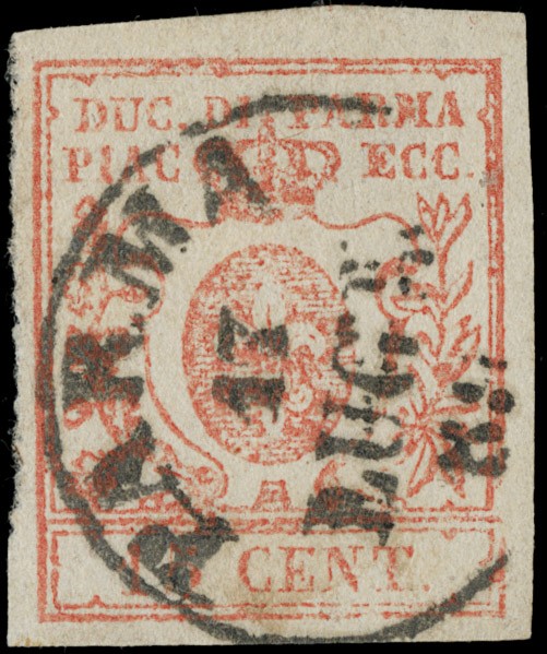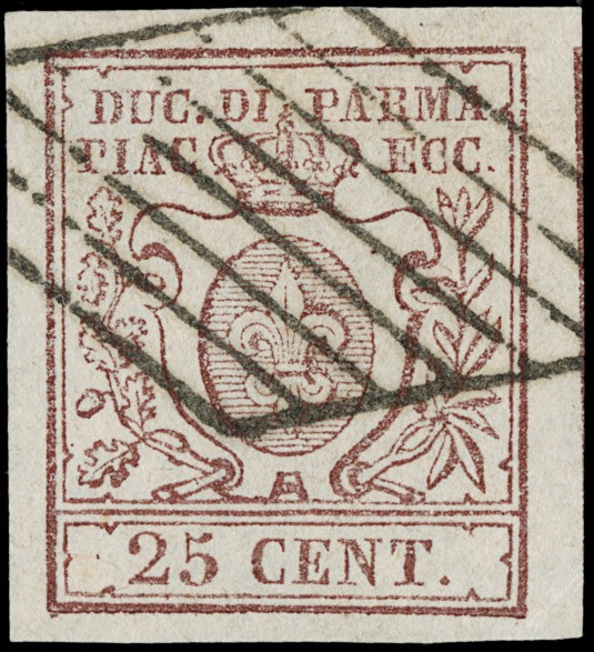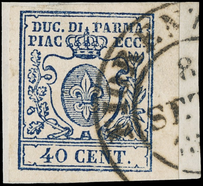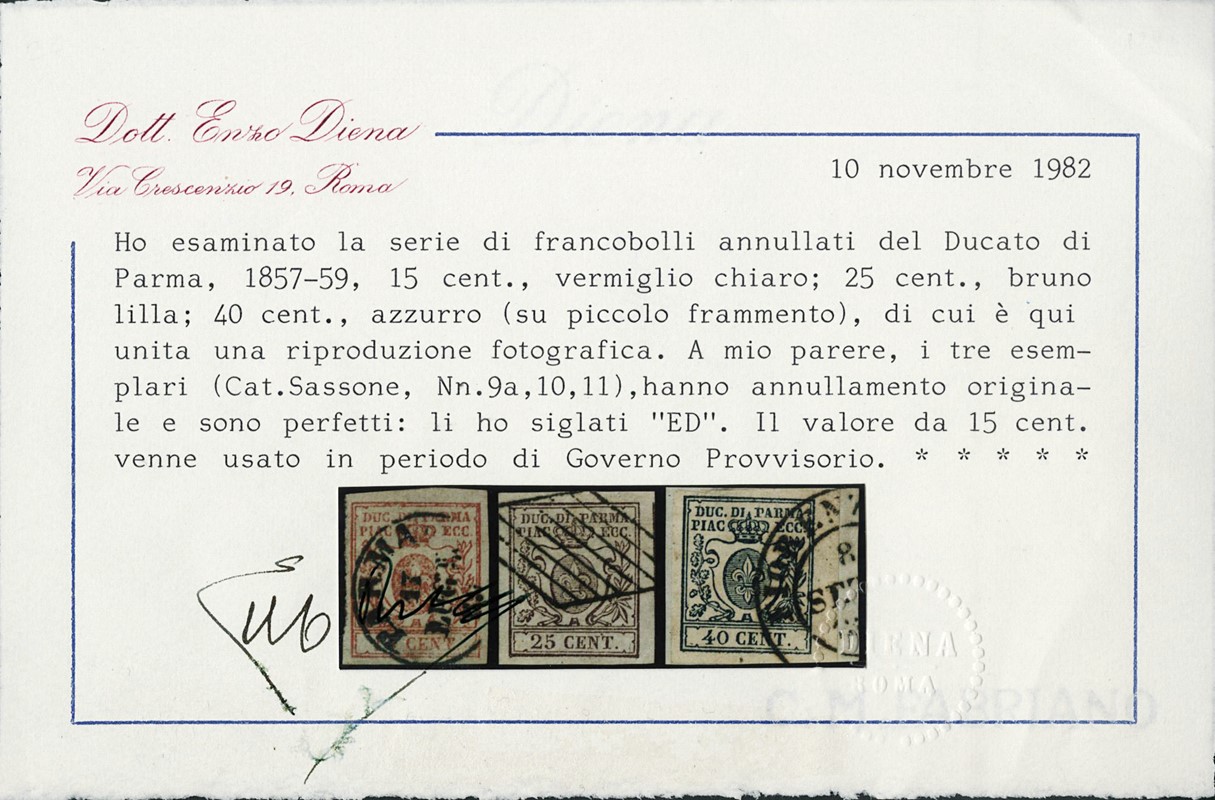 1857/59 - III emissione, la serie completa di tre valori: 15c vermiglio annullato 'PARMA 17 LUGL 59' (Periodo di Governo Provvisorio), 25c bruno lilla, 40c azzurro BdF con ottimi margini. CF E.Diena (Sassone 9/11 - Euro 2.500++)