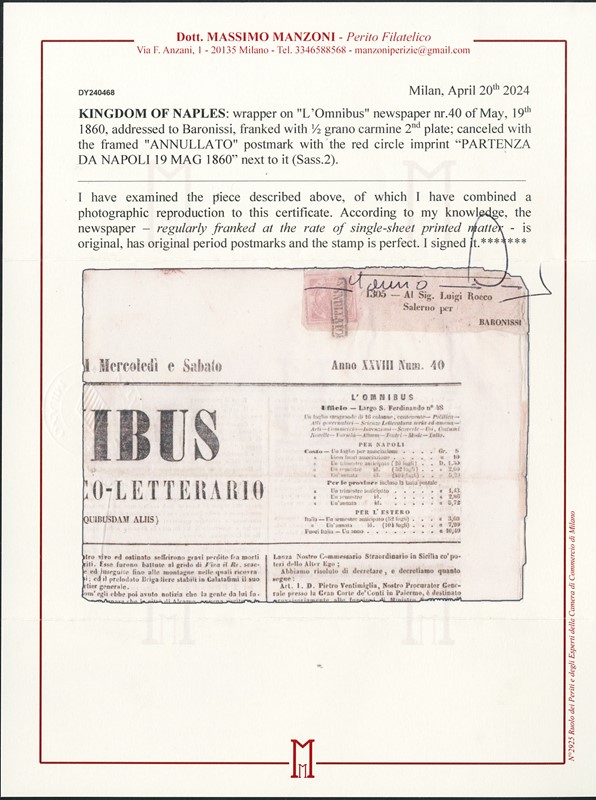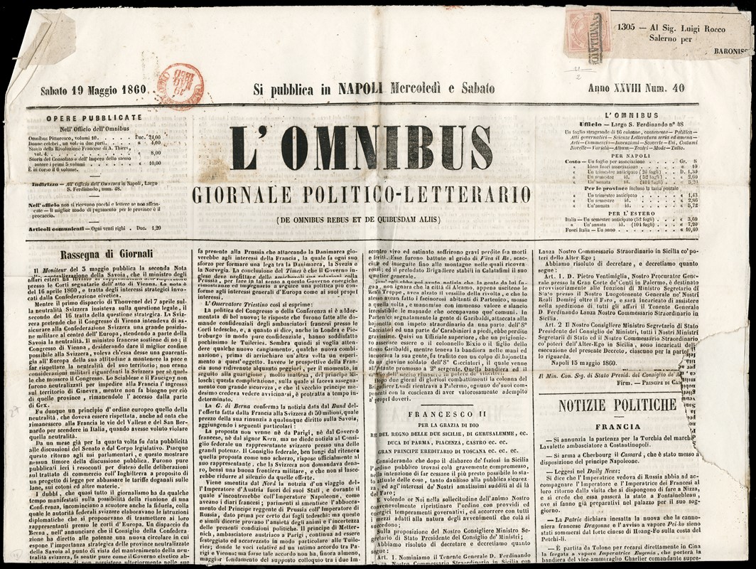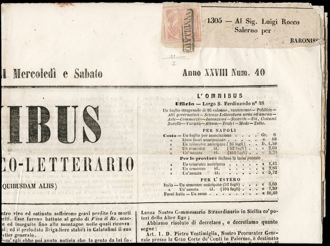 1858 - 1/2gr carminio II tavola, su giornale 'LOMNIBUS' IN 'PARTENZA DA NAPOLI 19 MAG 1860' per Baronissi. CF Manzoni (Sassone 2 - Euro 4.500)