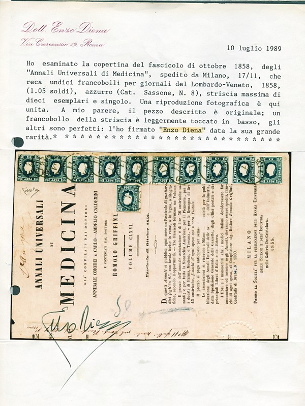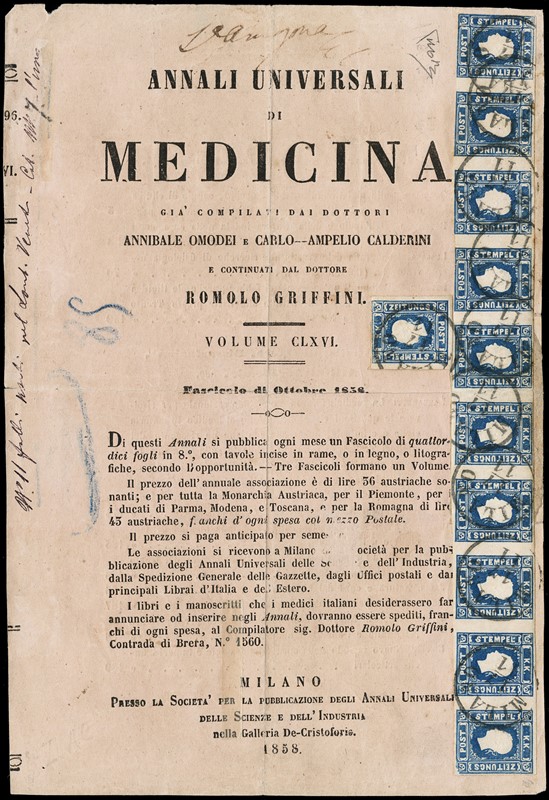 1858 - (1,05s.) azzurro ST10 e singolo su copertina completa degli 'Annali Universali di Medicina' (fascicolo di ottobre 1858) da 'MILANO 11/11'. L'ultimo francobollo della striscia ha l'angolo inferiore destro leggermente difettoso, insieme comunque spettacolare. CF E.Diena (Sassone FG8 - Euro 70.500)