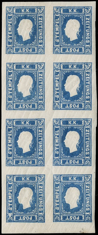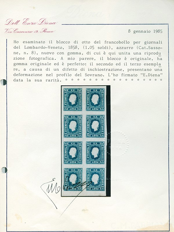 1858 - (1,05s) azzurro BL8 di cui quattro SL. CF E.Diena 'il II e il III esemplare, a causa di un difetto di inchiostrazione, presentano una deformazione del profilo del Sovrano' sul gozzo (Sassone FG8 - Euro 45.000+18.000=63.000+)