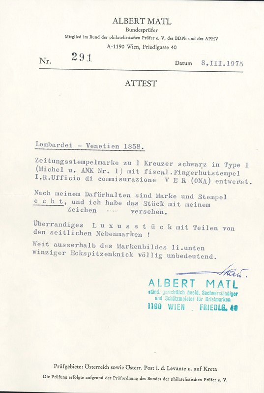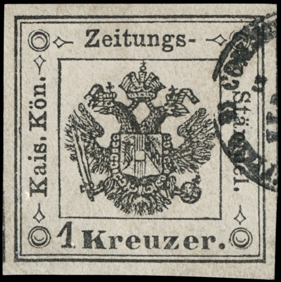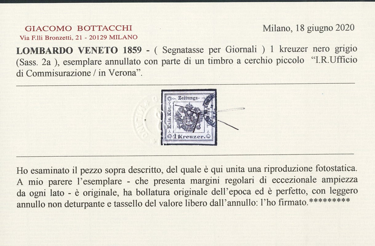 1858 - 1kr nero grigio, annullato con parte di timbro a cerchio piccolo 'I.R. Ufficio di Commisurazione in Verona'. Esemplare estremamente ben marginato e di qualita' eccezionale. Raro, CF Bottacchi e Matl (Sassone SG2a - Euro 22.000)