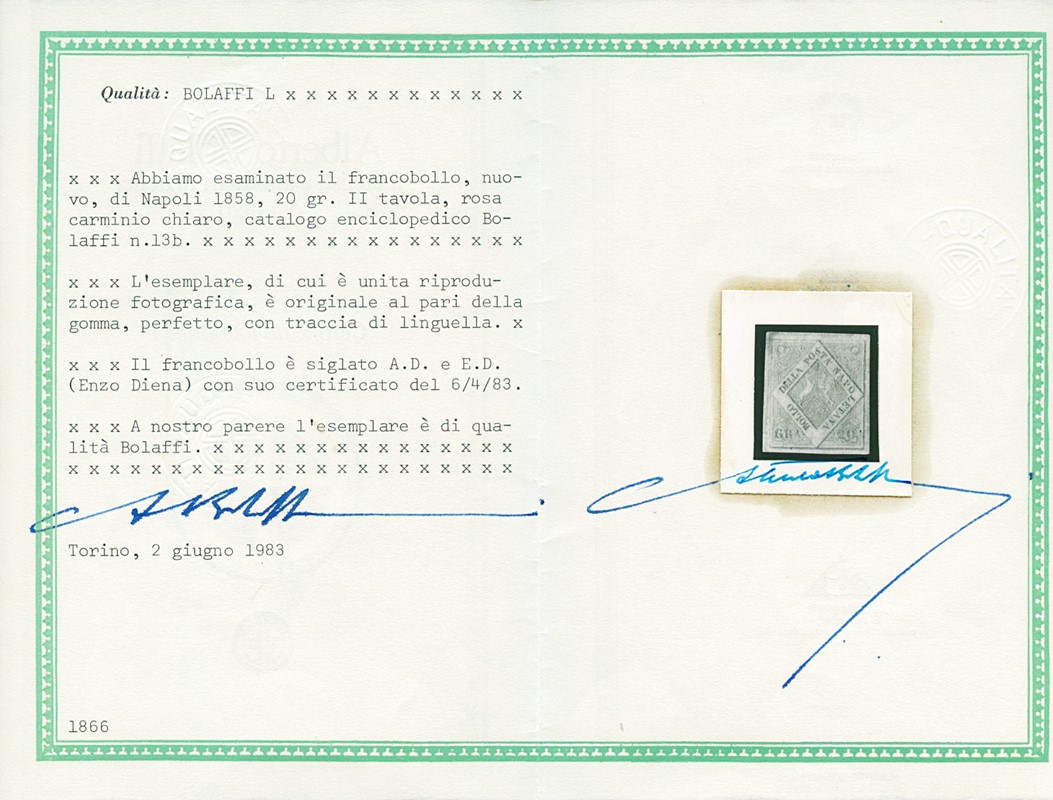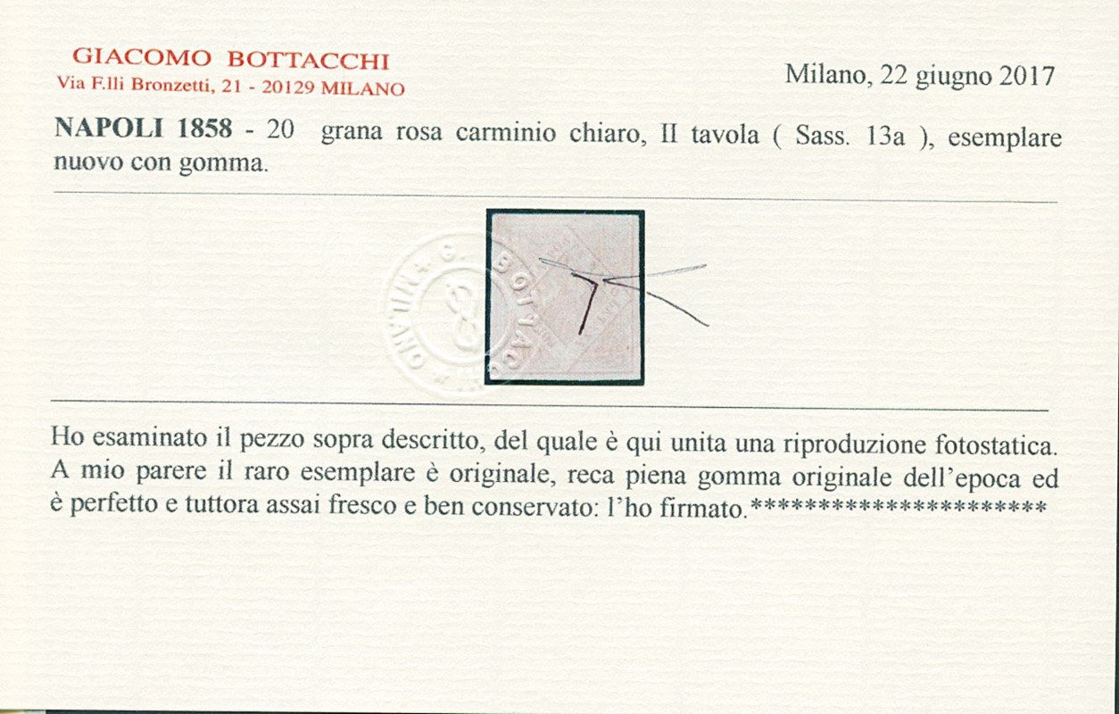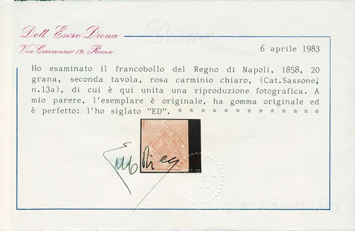 1858 - 20gr rosa carminio chiaro II tav., nuovo con piena gomma originale. Firma A.Diena, CF Bottacchi, Bolaffi ed E.Diena (Sassone 13a - Euro 38.000)
