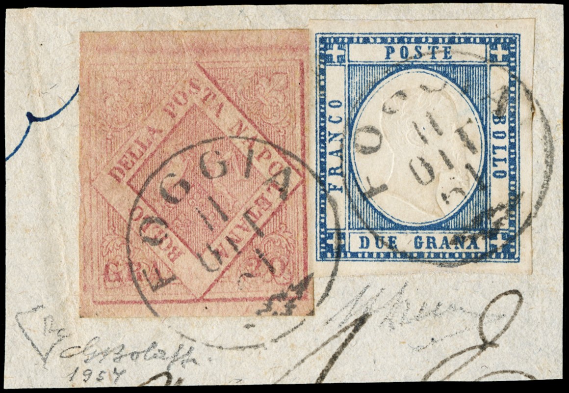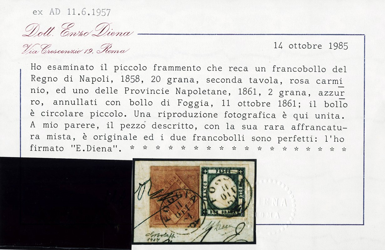 1858 - 20gr rosa carminio II tav. in affrancatura mista con Napoli Province 2gr azzurro, annullati con circolare piccolo 'FOGGIA 11 OTT 61' (pt.12). Firme Giulio Bolaffi e A.Diena, CF E.Diena (Sassone 13a+20b+pt.12 - Euro 9.000++)