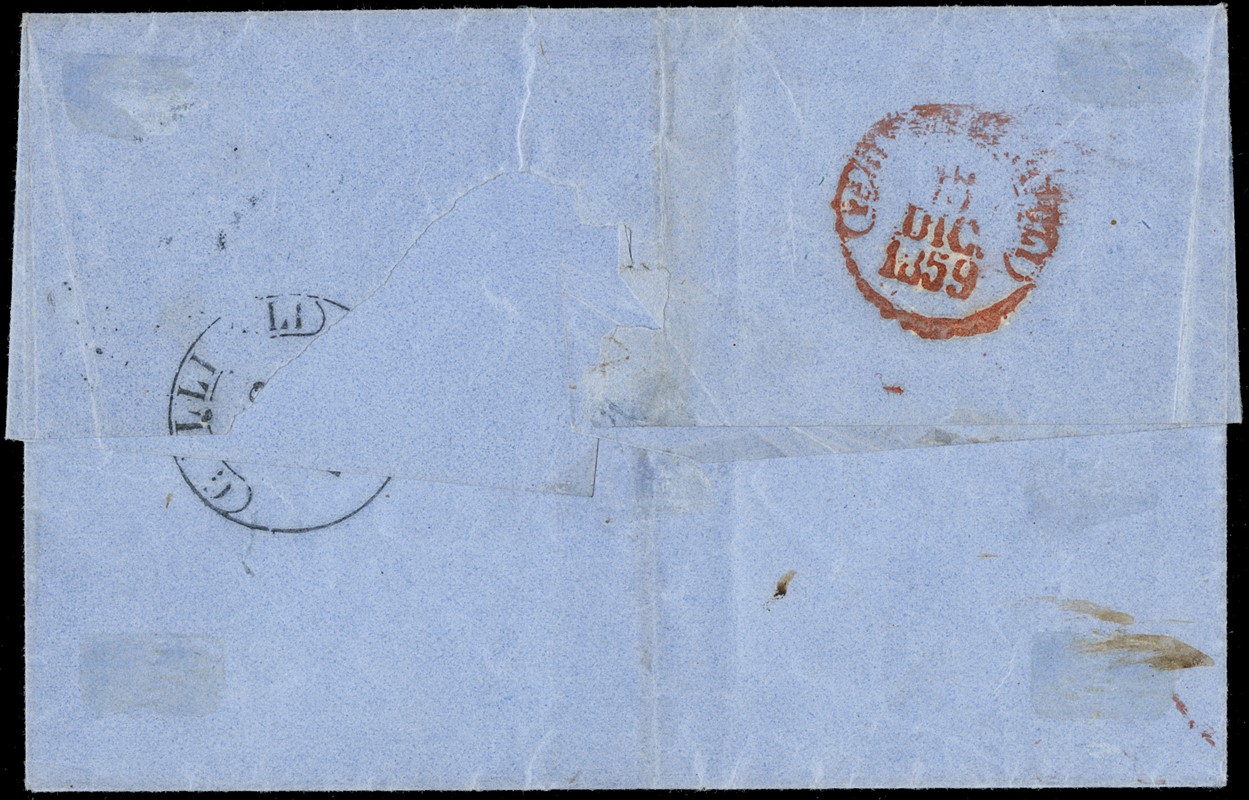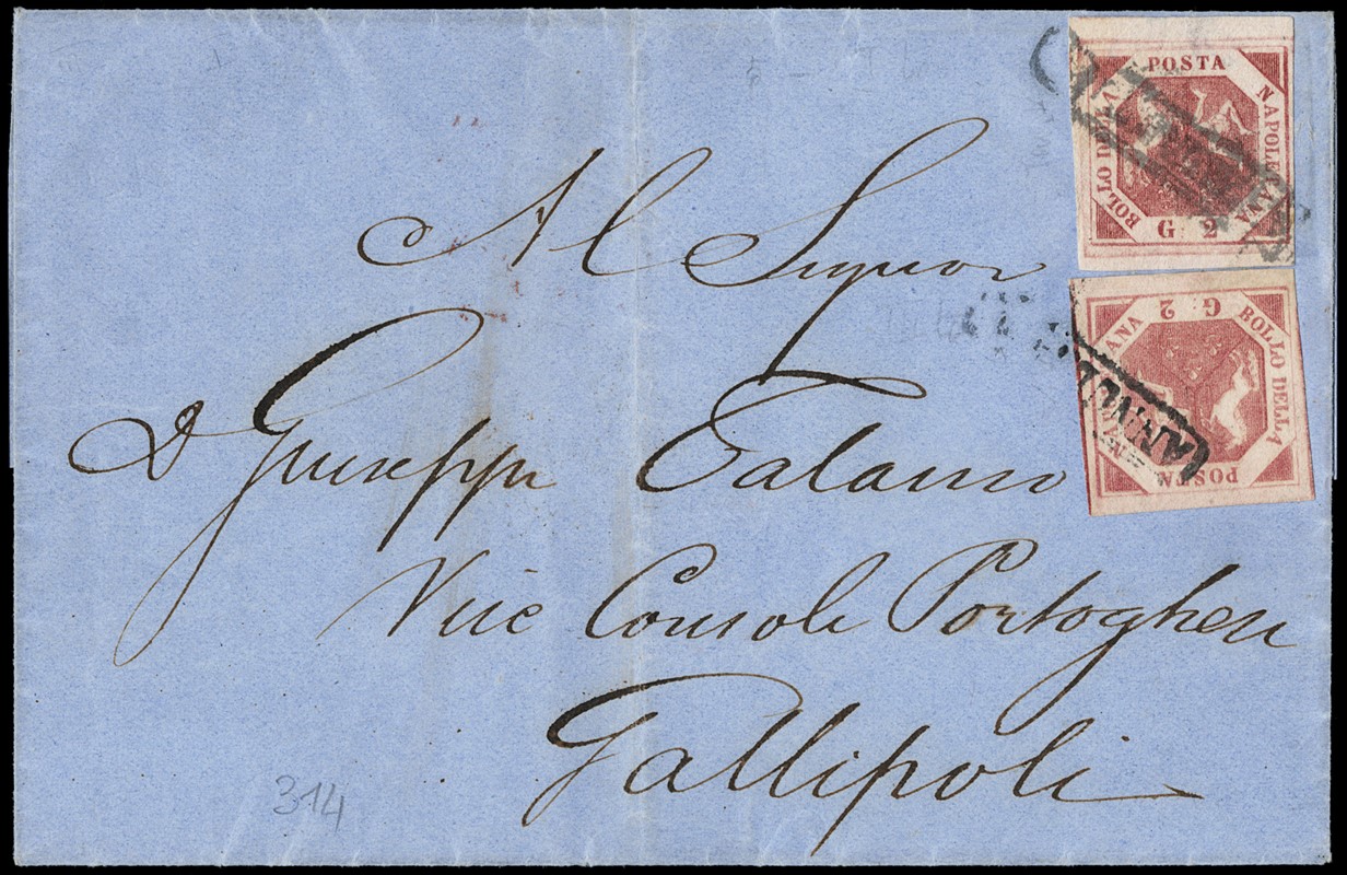 1858 - 2gr carminio vivo, I tav. e 2gr carminio, III tav., 'ANNULLATO' su lettera da Napoli 15 dic 1859 per Gallipoli (Sassone 5f+7d - Euro 4.000)