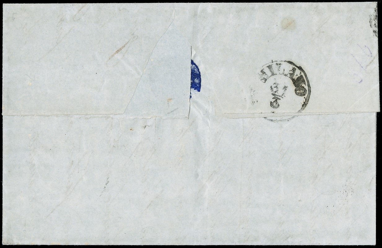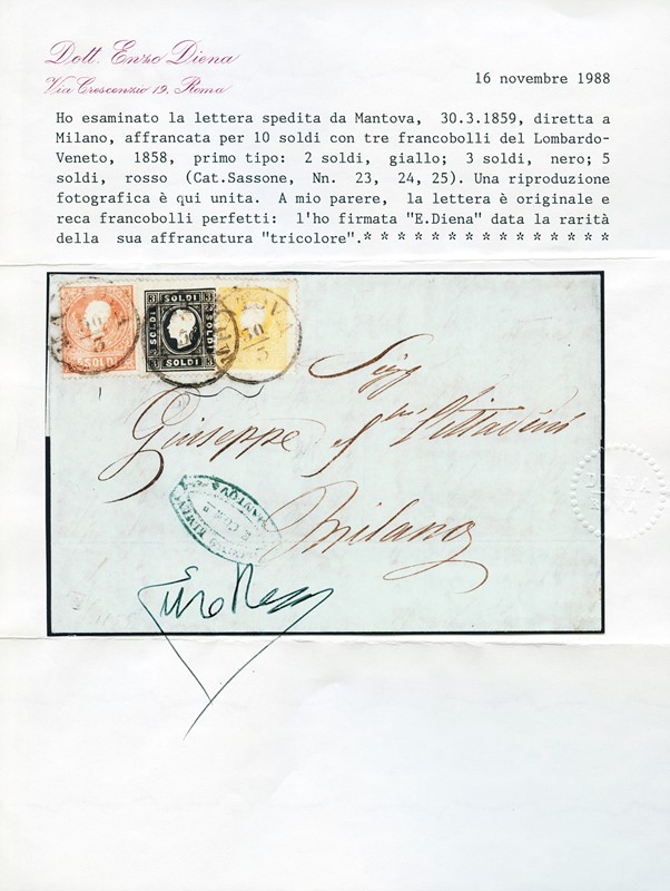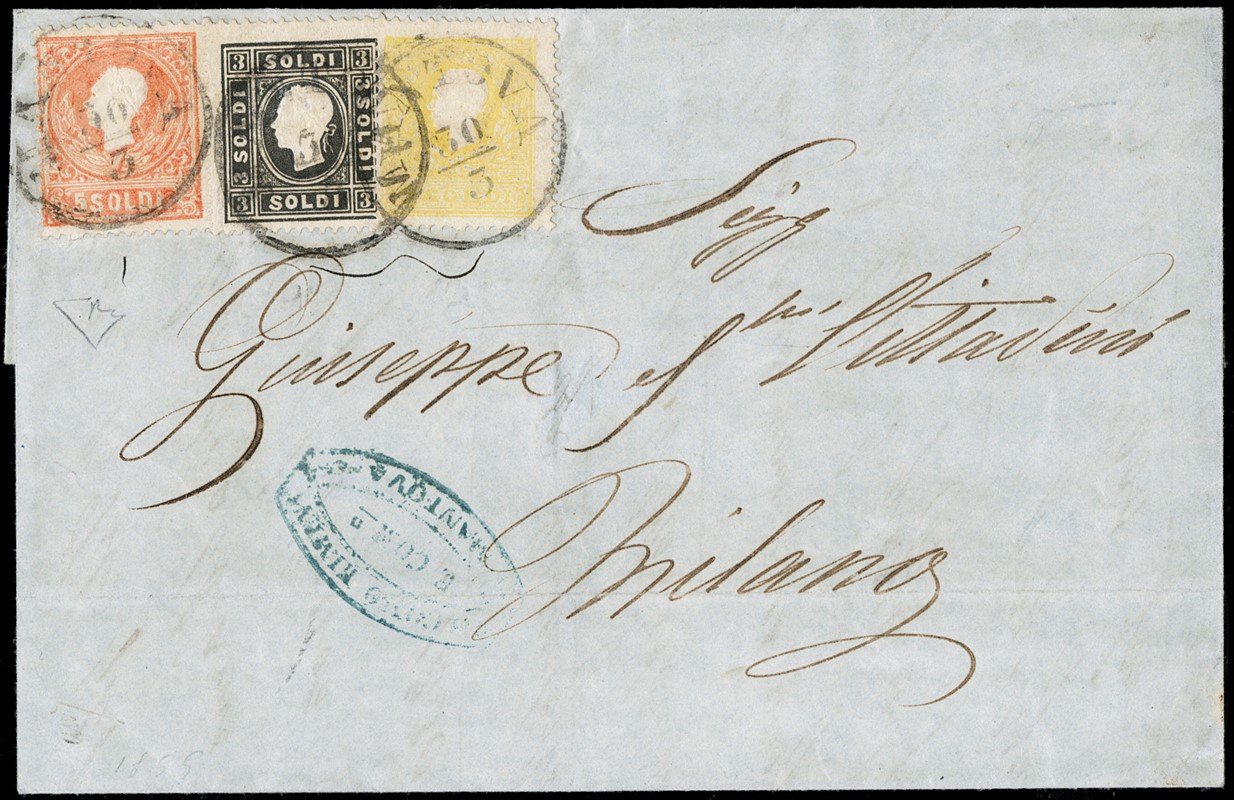 1858 - 2s giallo, 3s nero e 5s rosso, tutti I tipo, da 'MANTOVA 30/3' (1859) a Milano. Rara affrancatura tricolore. CF E.Diena (Sassone 23+24+25 - Euro 22.500++)