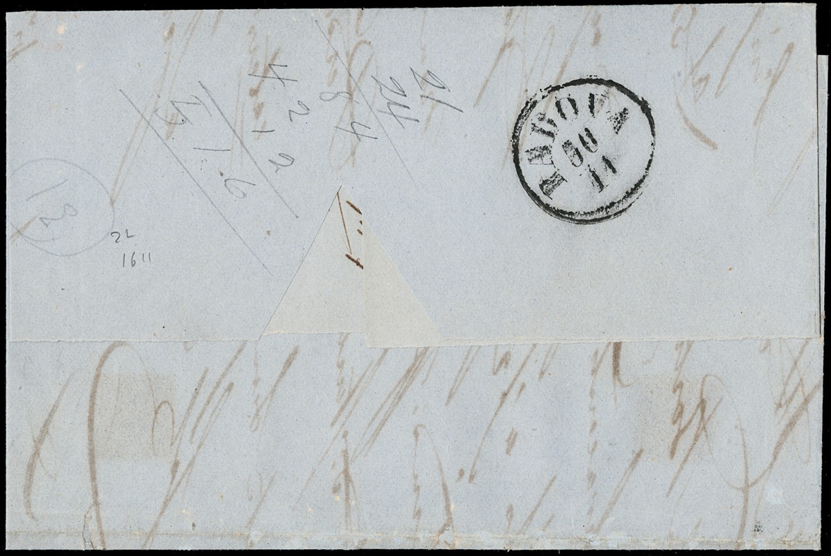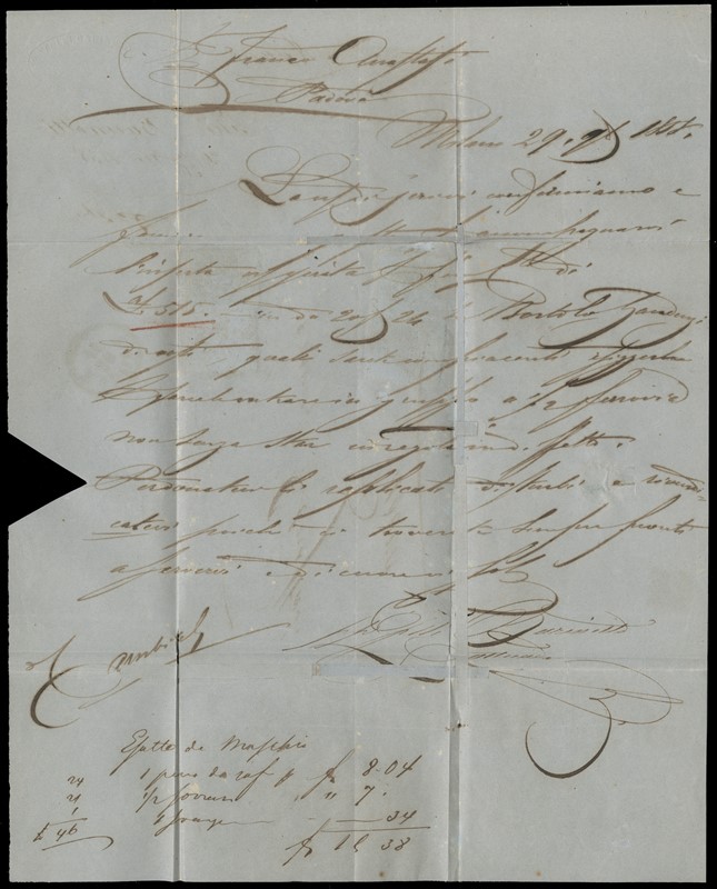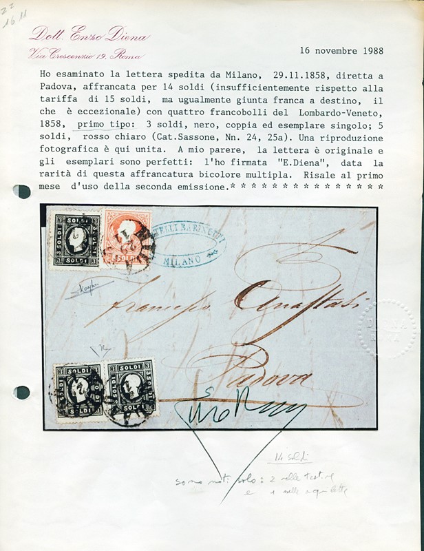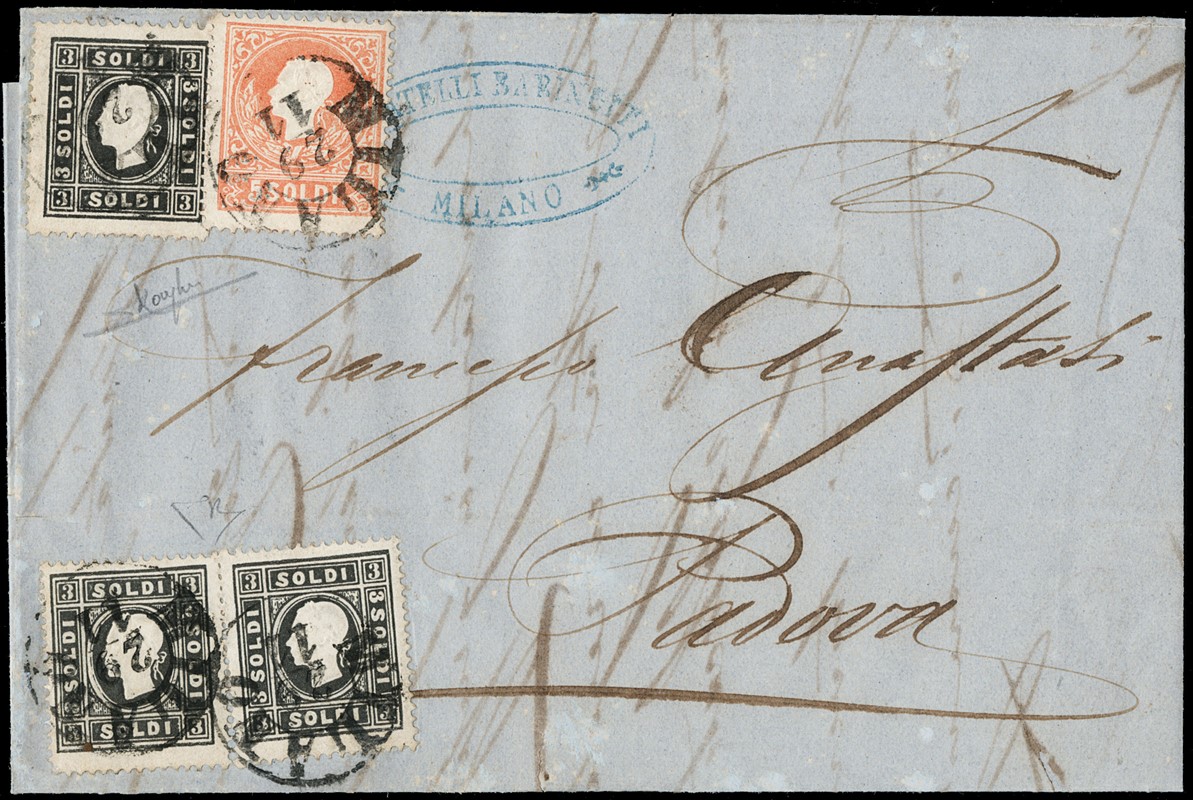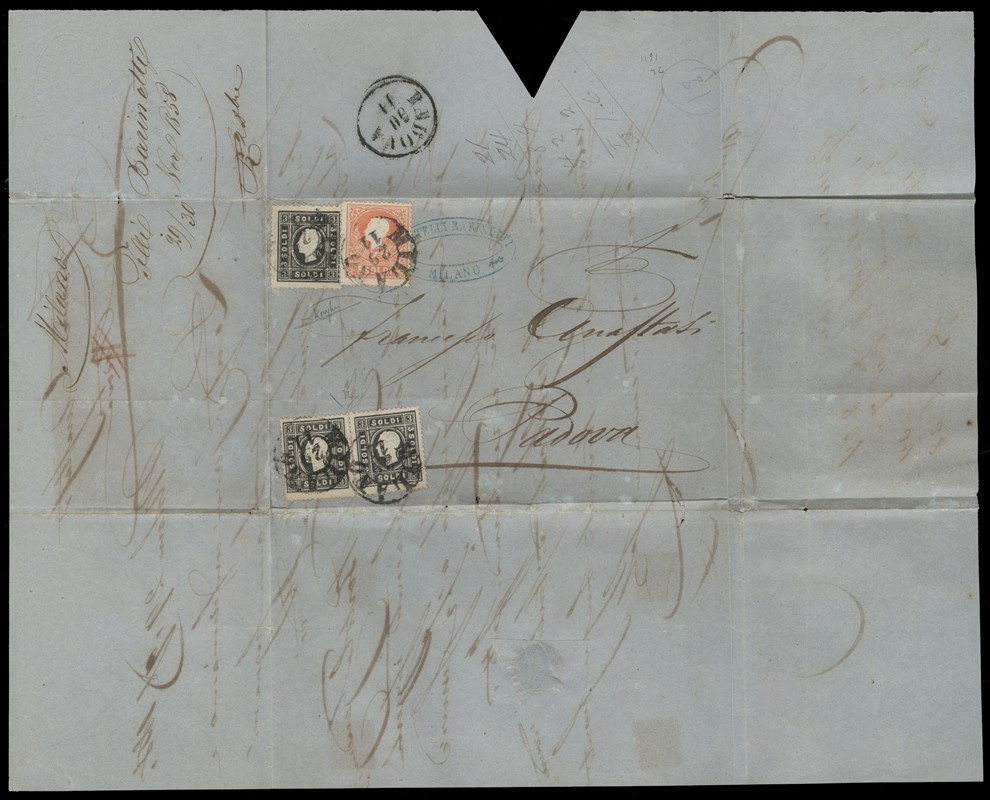 1858 - 3s nero grigio I tipo, tre esemplari, e 5s rosso I tipo da 'MILANO 29/11' (58). Rarissima lettera sottoaffrancata di un soldo. CF E.Diena (Sassone 24a+25 - Euro 10.000++)