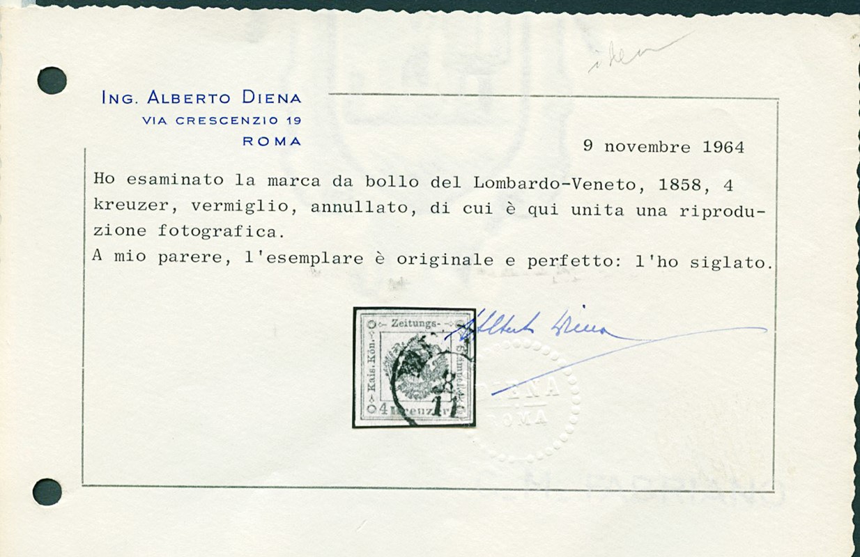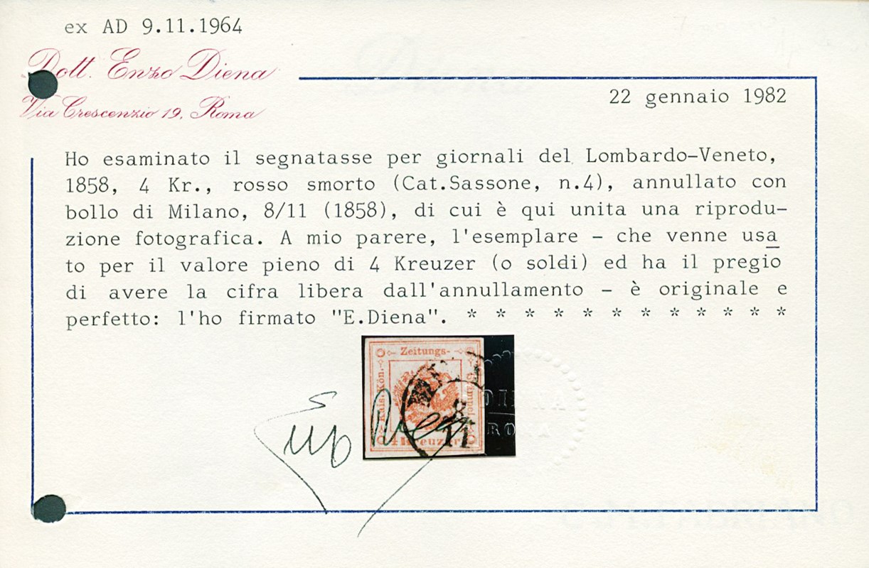 1858 - 4kr rosso smorto annullato 'MILANO 8/11' (58), quindi usato per 4kr. Ottimi margini. Firme Em.Diena e Oliva, CF Alberto ed E.Diena (Sassone SG4 - Euro 32.500)