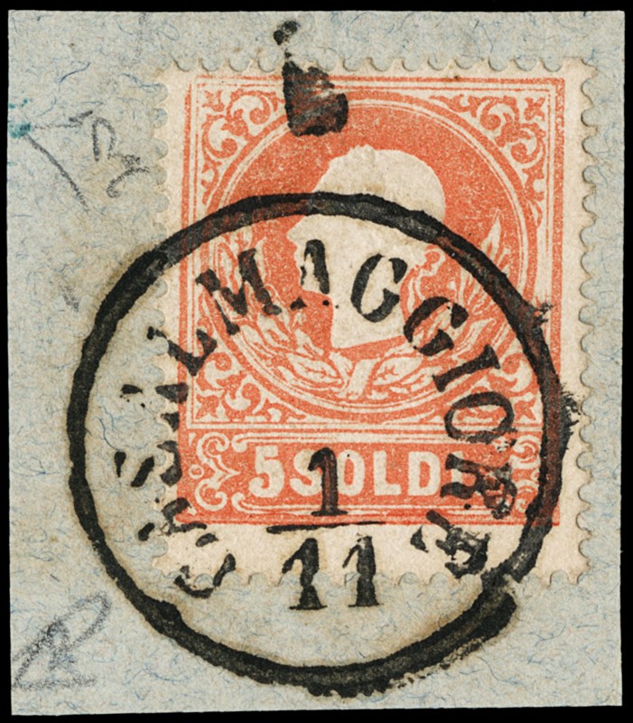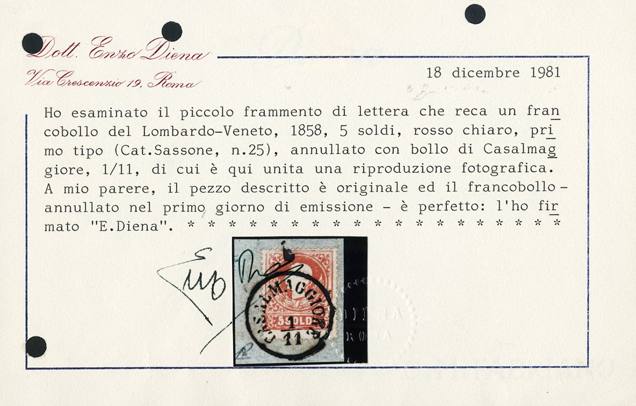 1858 - 5s rosso chiaro su frammento annullato 'CASALMAGGIORE 1/11' (58). Primo giorno d'uso della II emissione. CF E.Diena (Sassone 25a - Euro 3.250+)