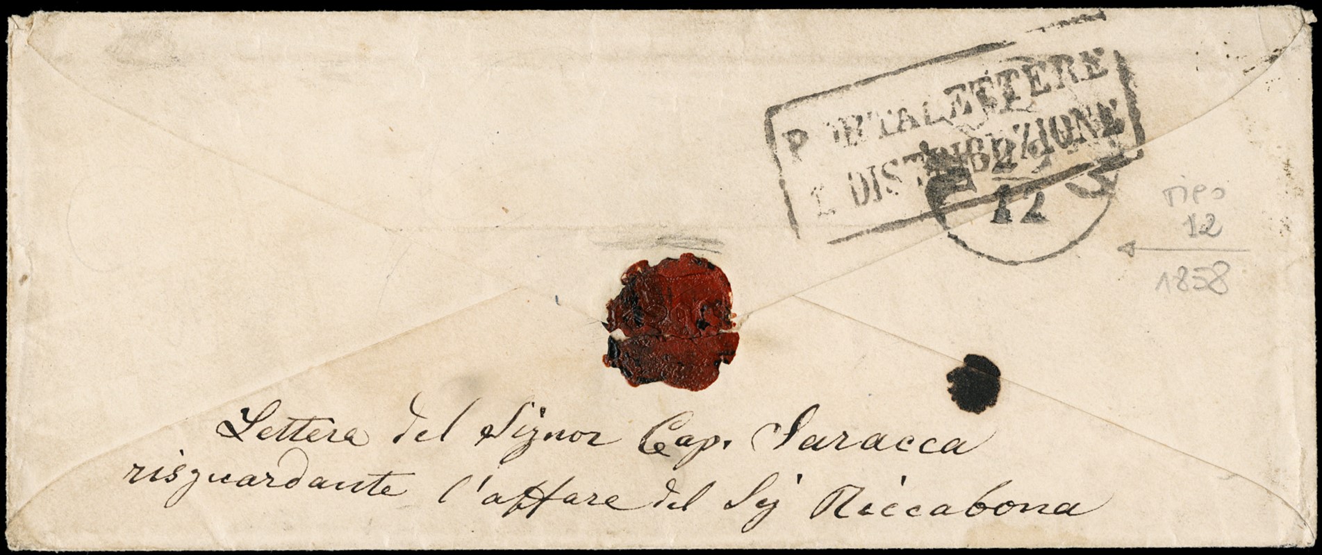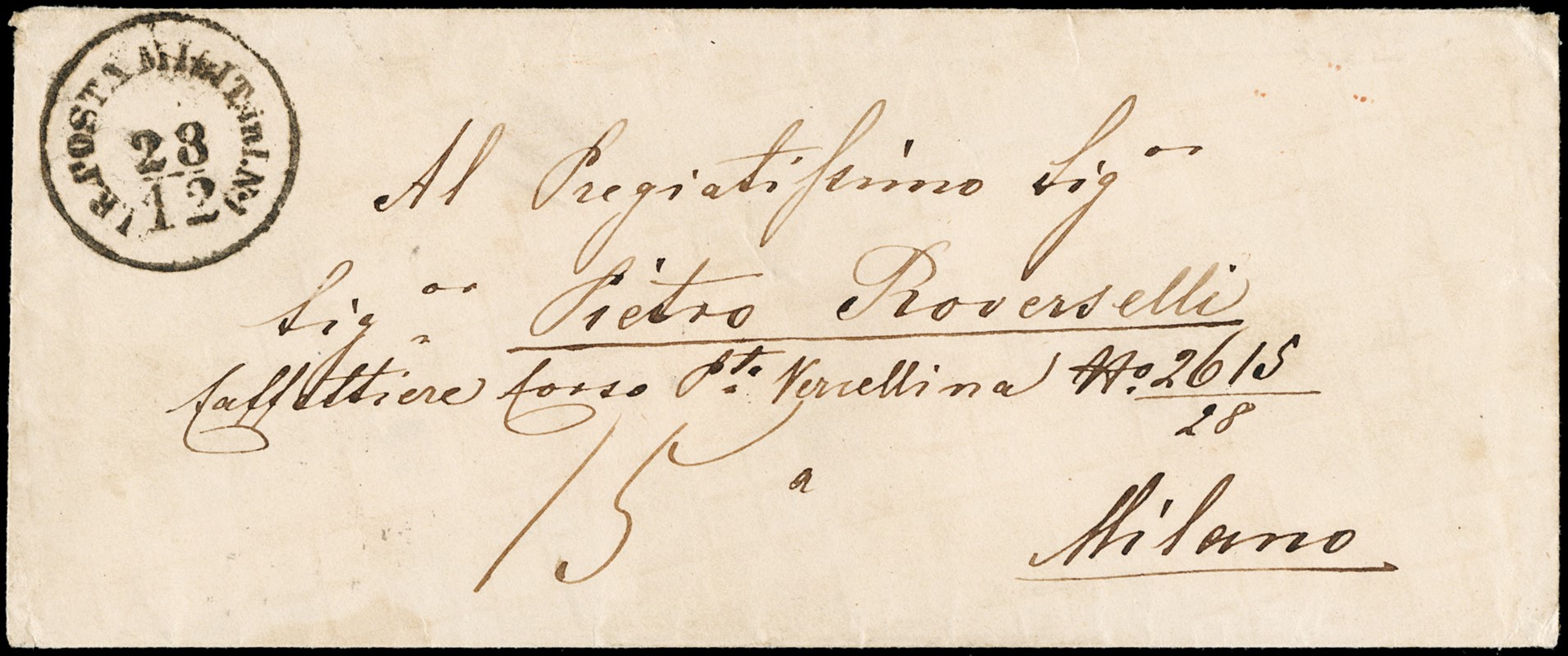 1858 - Busta non affrancata diretta a Milano, con sul fronte il cerchio (C1) 'I.R. POSTA MILIT. IN I. N.1 - 28/12' in uso a Bologna (Sassone pt.13 - Euro - )