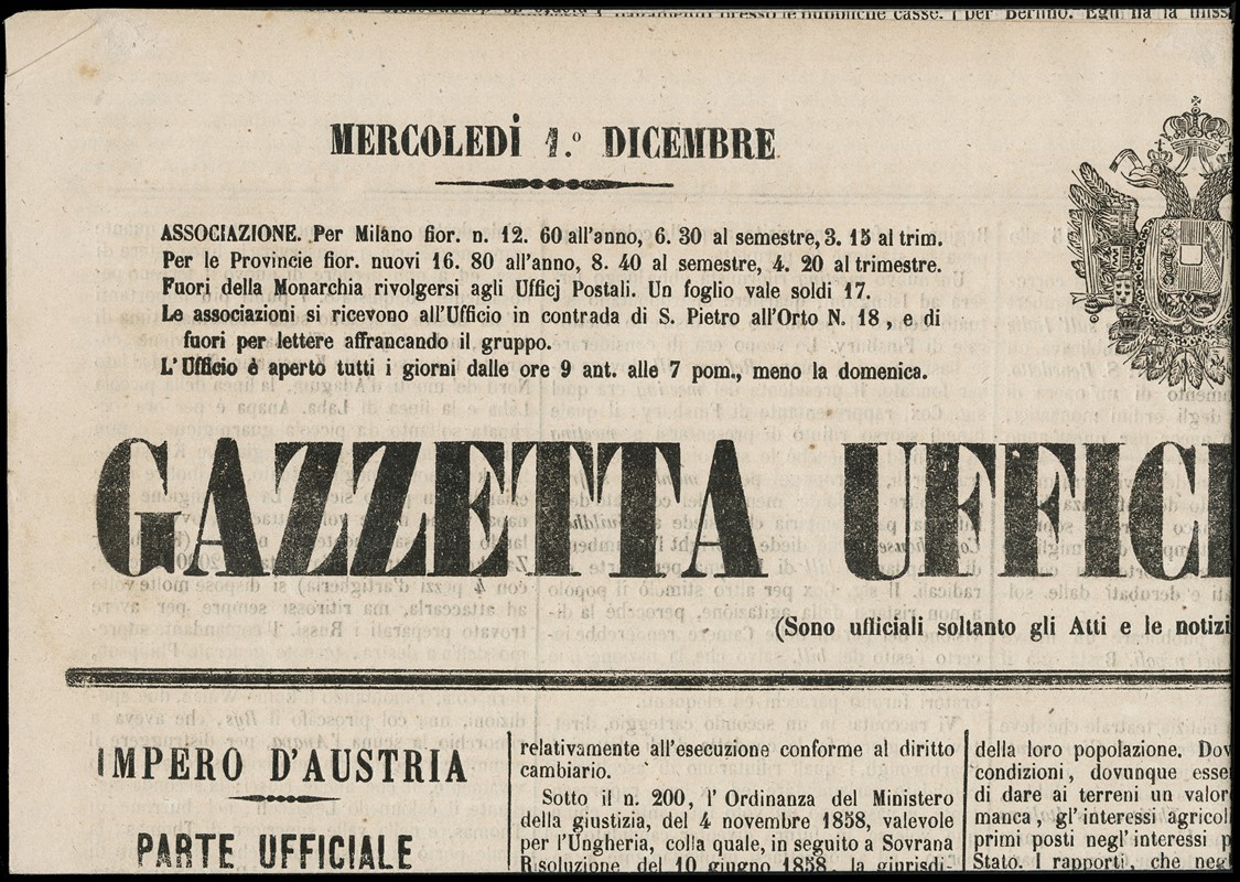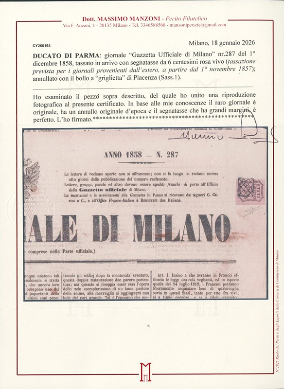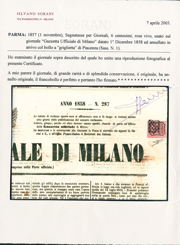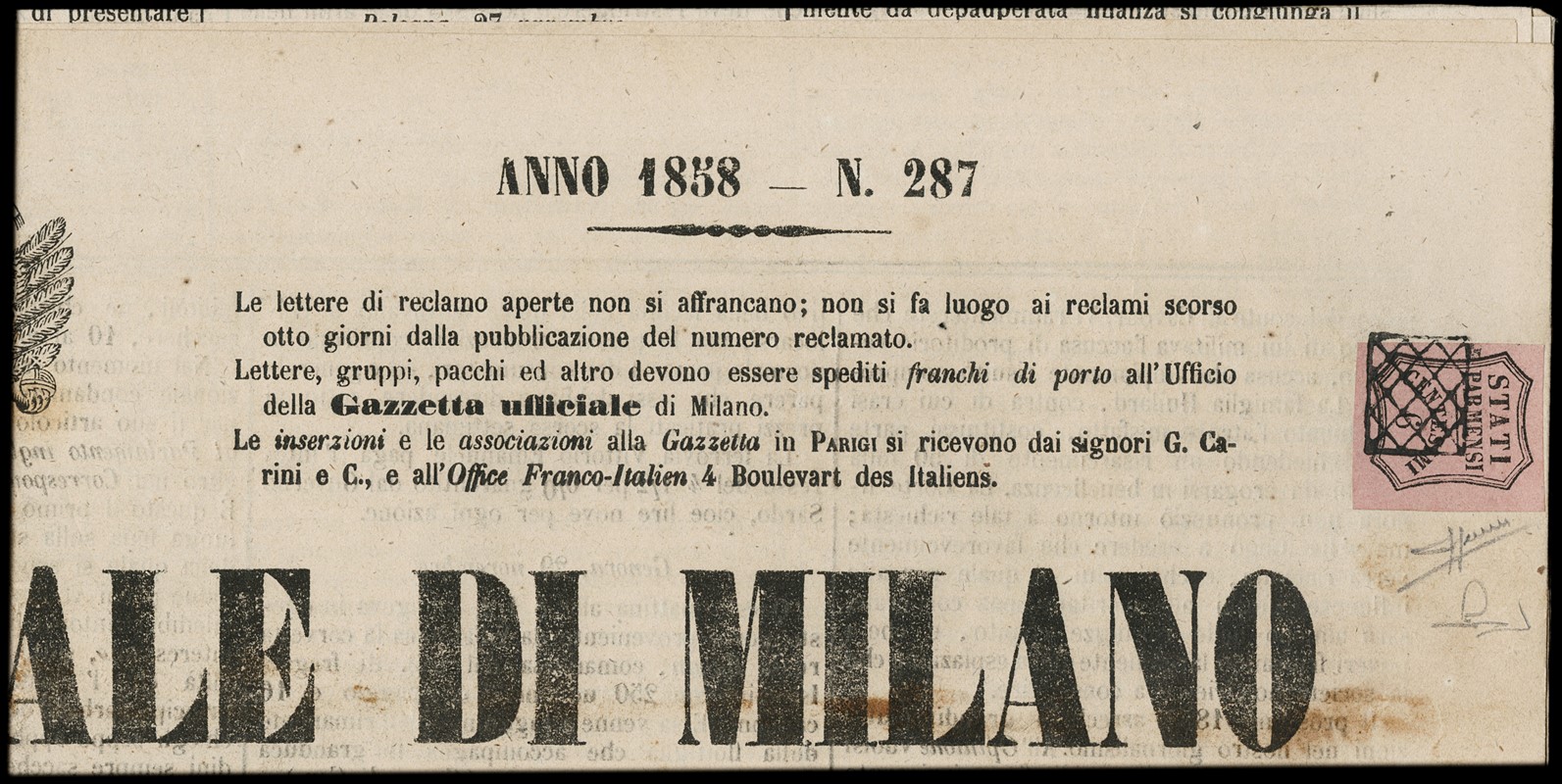 1858 - Segnatasse per giornali, 6c rosa vivo BdF con grandi margini, annullato con griglietta su 'Gazzetta Ufficiale di Milano' del I dicembre 1858. Rarita' in splendido stato di conservazione. CF Manzoni e Sorani (Sassone STG1 - Euro 30.000)