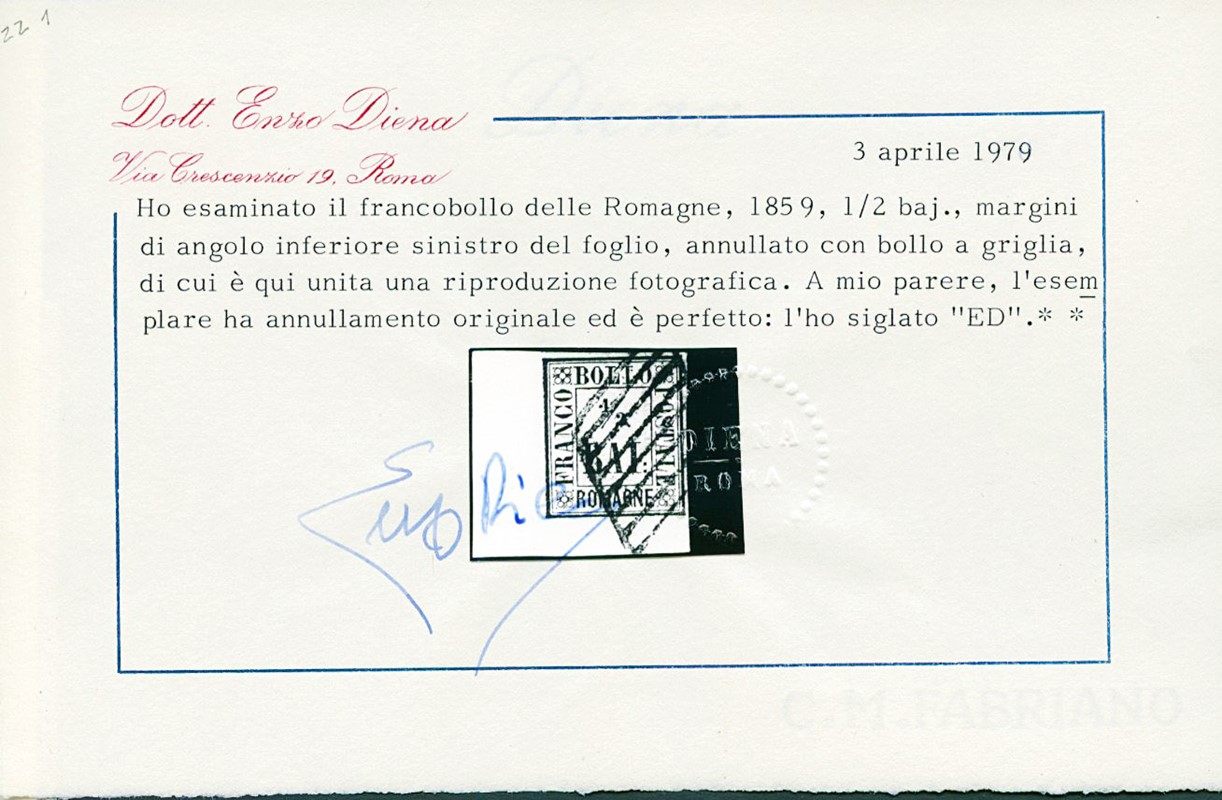 1859 - 1/2b giallo paglia AdF, usato. Splendido e raro. Sigla A.Diena e CF E.Diena (Sassone 1 - Euro 700++)