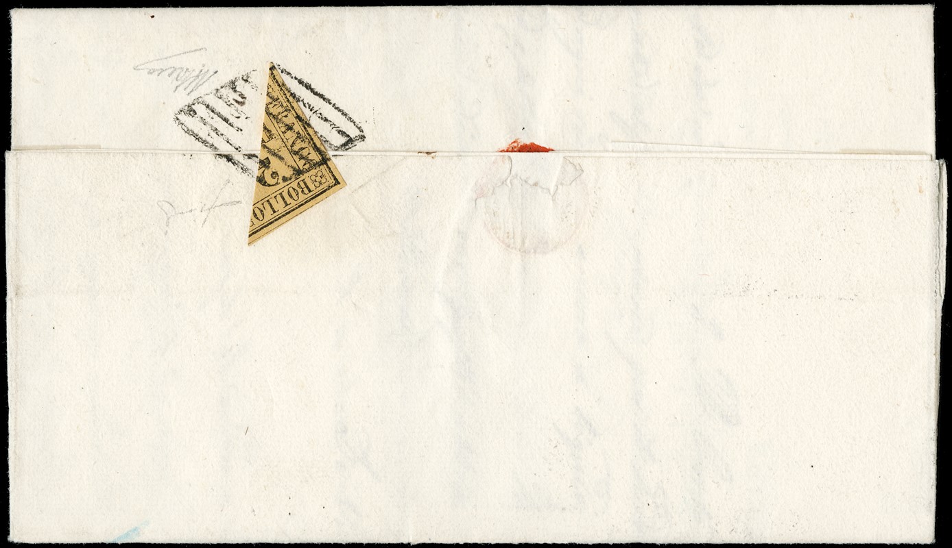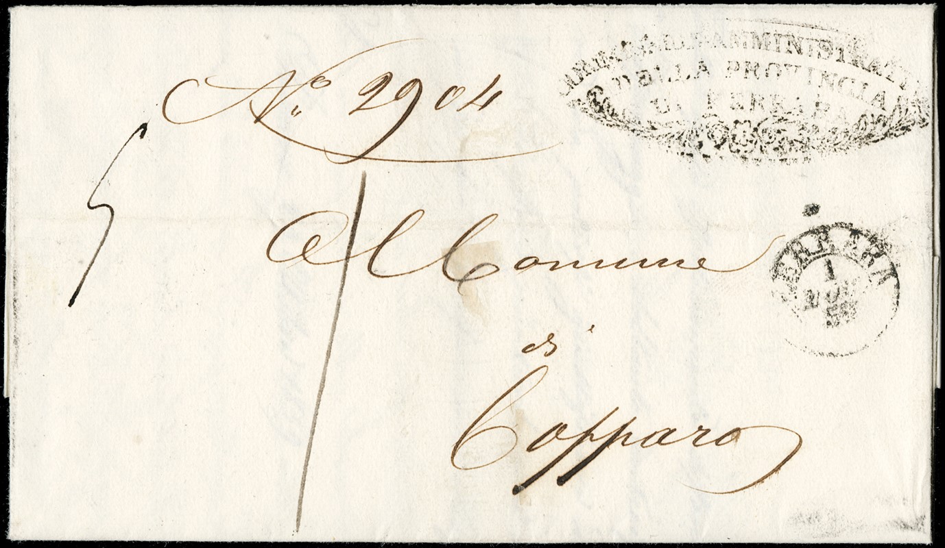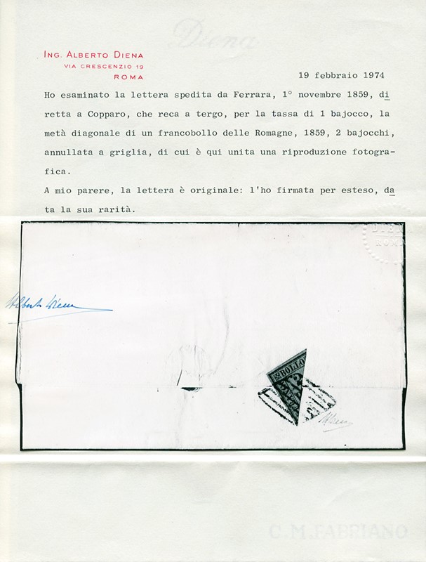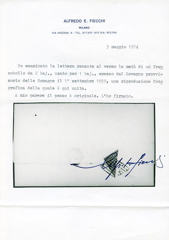 1859 - 2b giallo arancio, frazionato diagonalmente a meta', al verso di lettera da 'FERRARA 1 NOV 59' a Copparo. Raro frazionamento e data interessante essendo il I giorno di conversione dei bajocchi in moneta sarda. CF A.Diena e Fiecchi (Sassone 3 - Euro