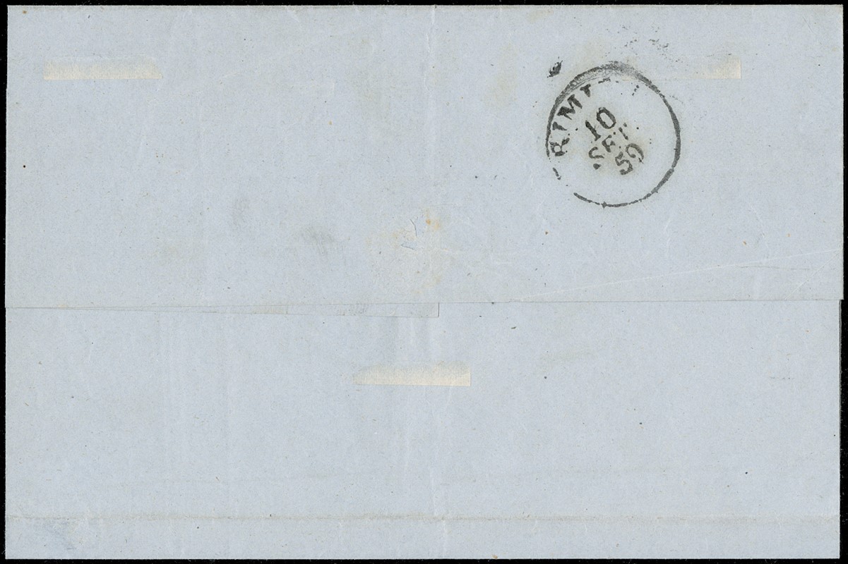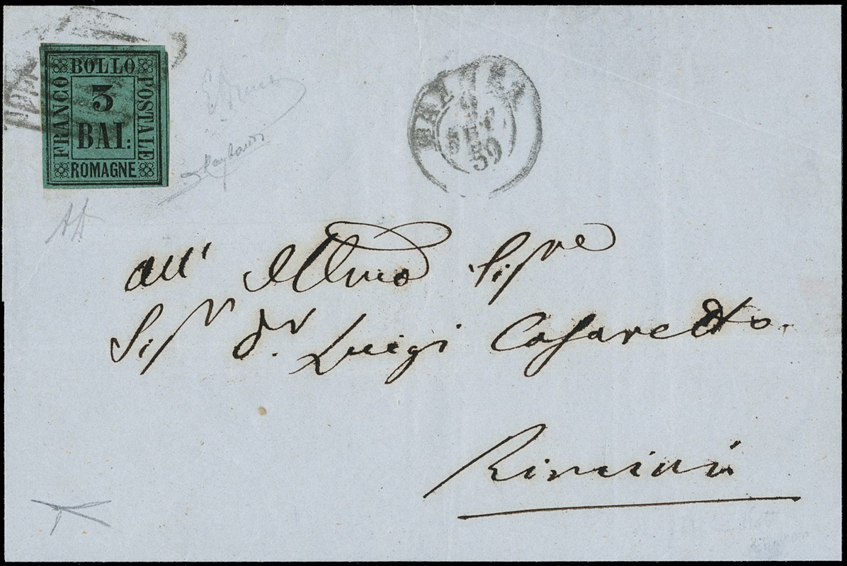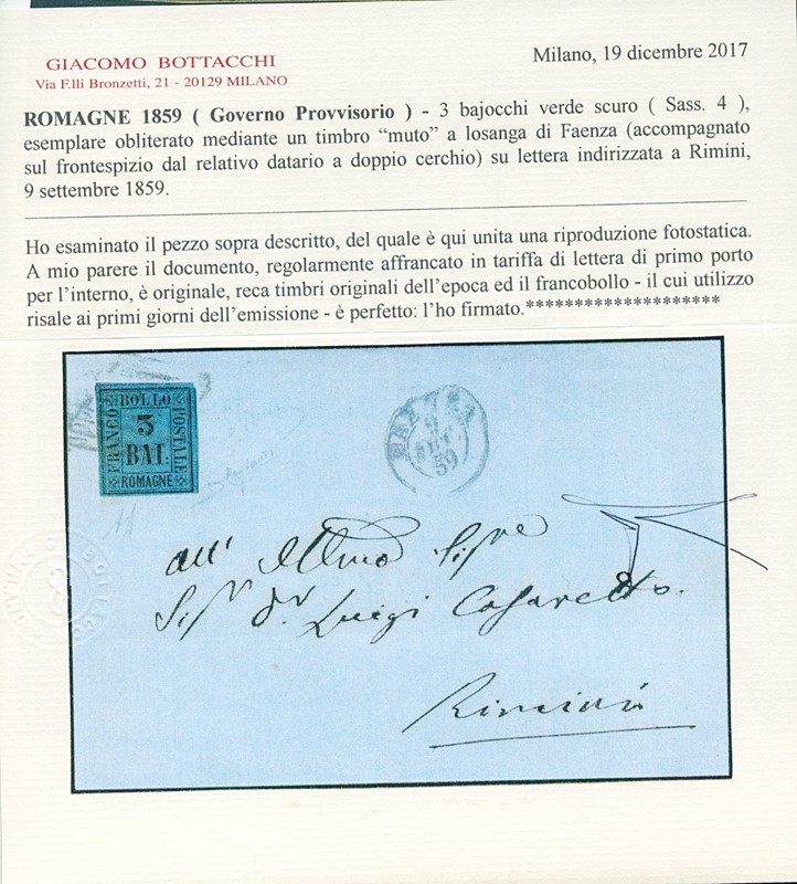 1859 - 3b verde scuro da 'FAENZA 9 SET 59' a Rimini. Splendida missiva spedita nei primi giorni di validita' postale. Firme Em.Diena, A.Diena, Raybaudi e CF Bottacchi (Sassone 4 - Euro 5.000)