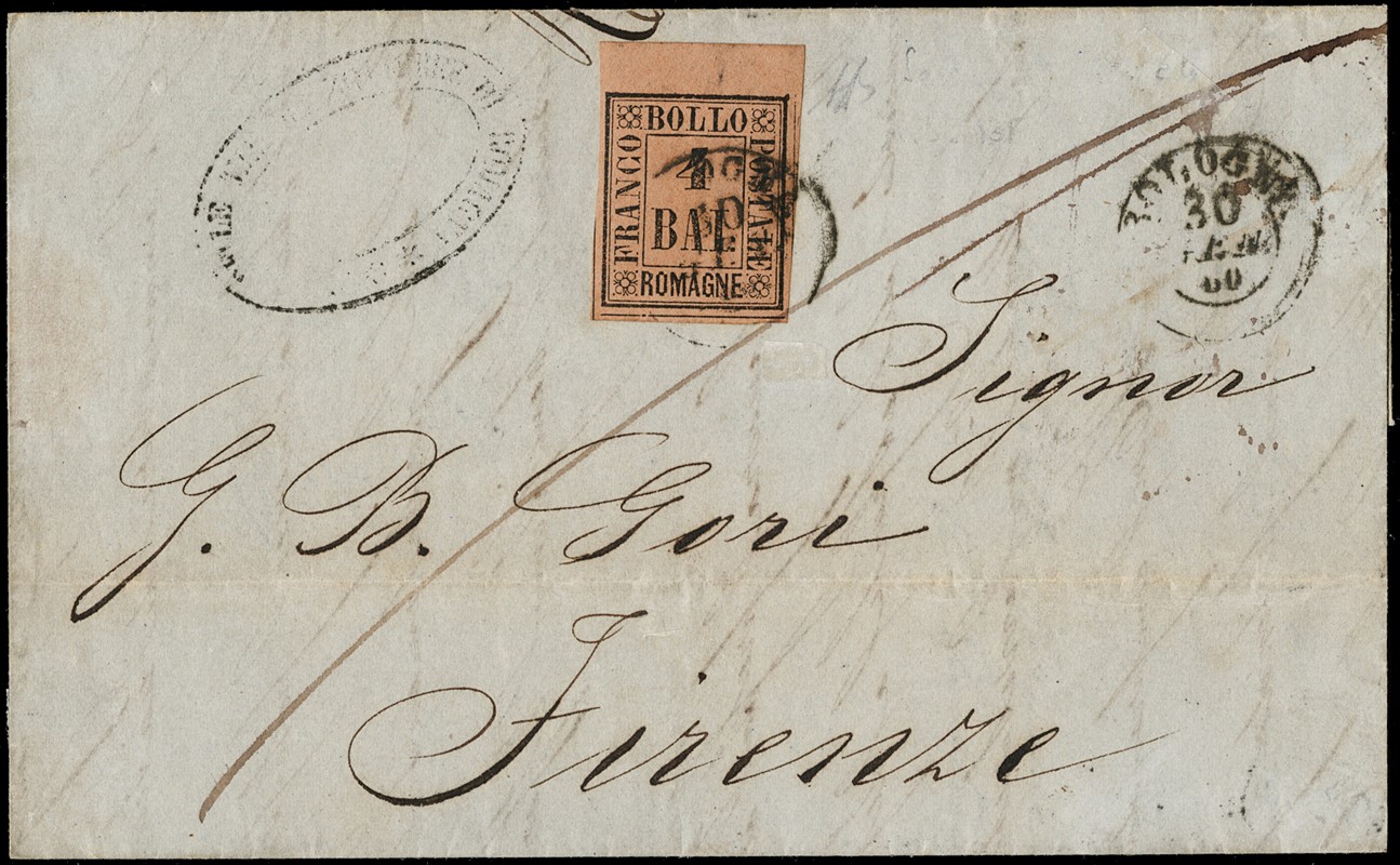 1859 - 4b fulvo, BdF superiore, da 'BOLOGNA 30 GEN 60' a Firenze. Sigla A.Diena (Sassone 4 - Euro 1.625+)