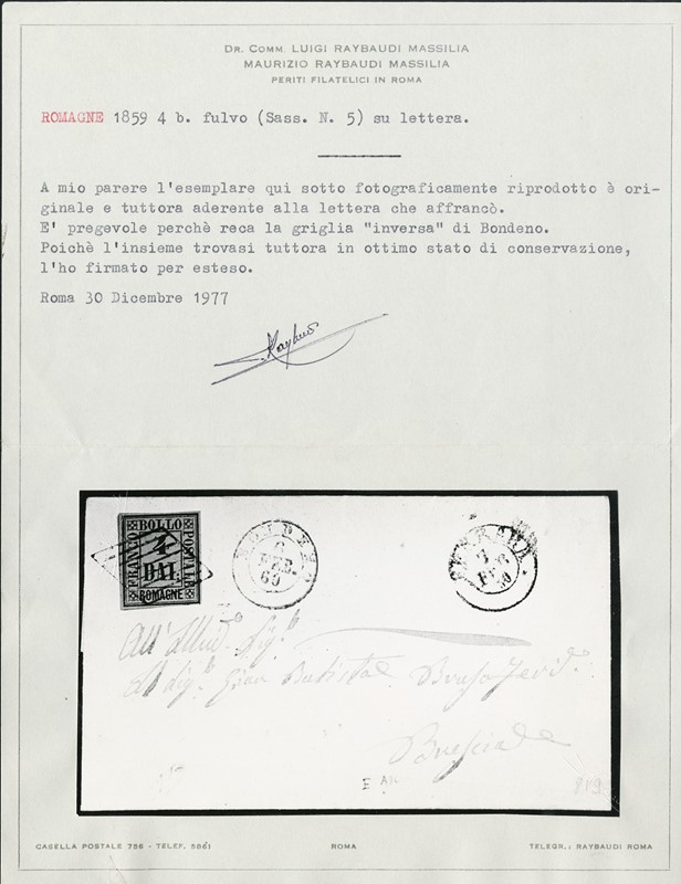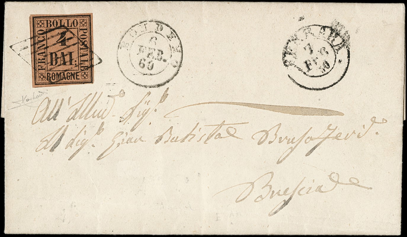 1859 - 4b fulvo da 'BONDENO 6 FEB. 60' a Brescia, annullato con griglia inversa di Bondeno. Uso tollerato fuori periodo di validita' ufficiale. Splendido, CF L.Raybaudi (Sassone 5+pt.12 - Euro 7.625+)