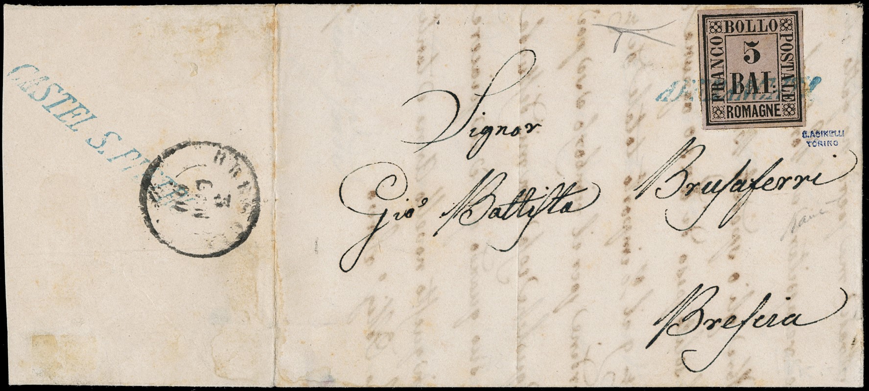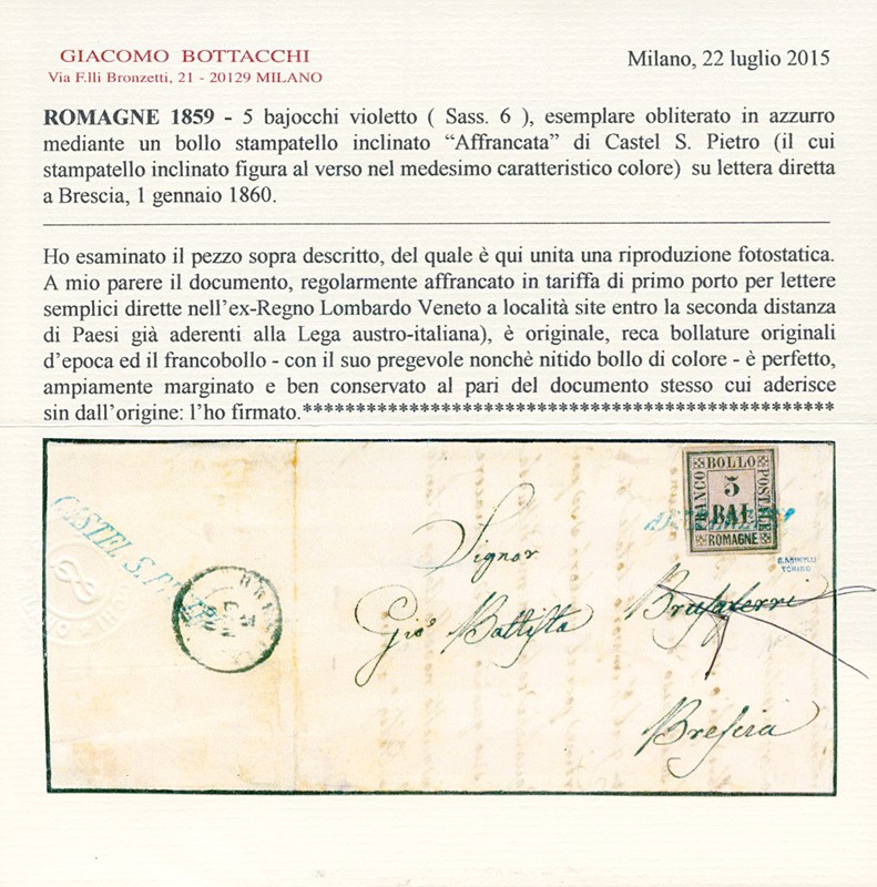 1859 - 5b violetto, al recto di lettera del 1 gennaio 1860, da Castel S. Pietro (stampatello inclinato azzurro al verso) a Brescia, annullato con bollo 'AFFRANCATA' (SI azzurro), rarissimo quale unico annullatore. Splendido, CF Bottacchi e timbrino Asinel