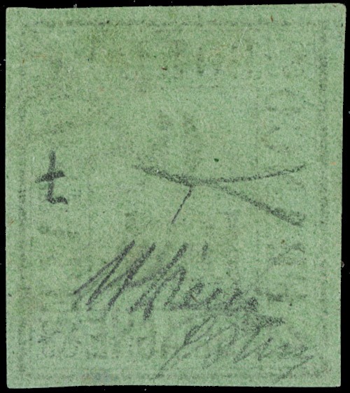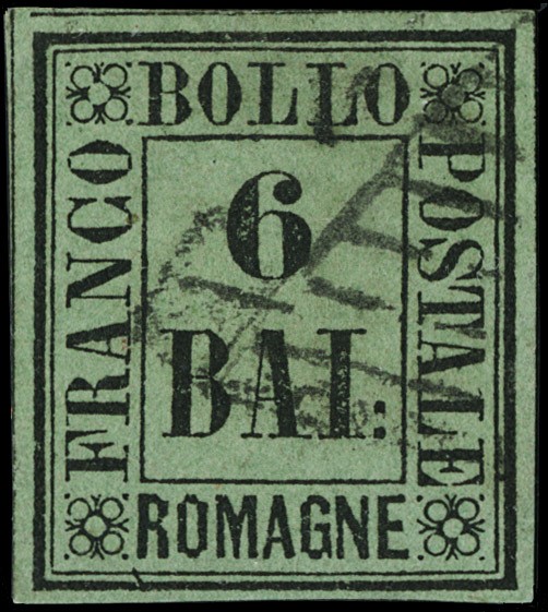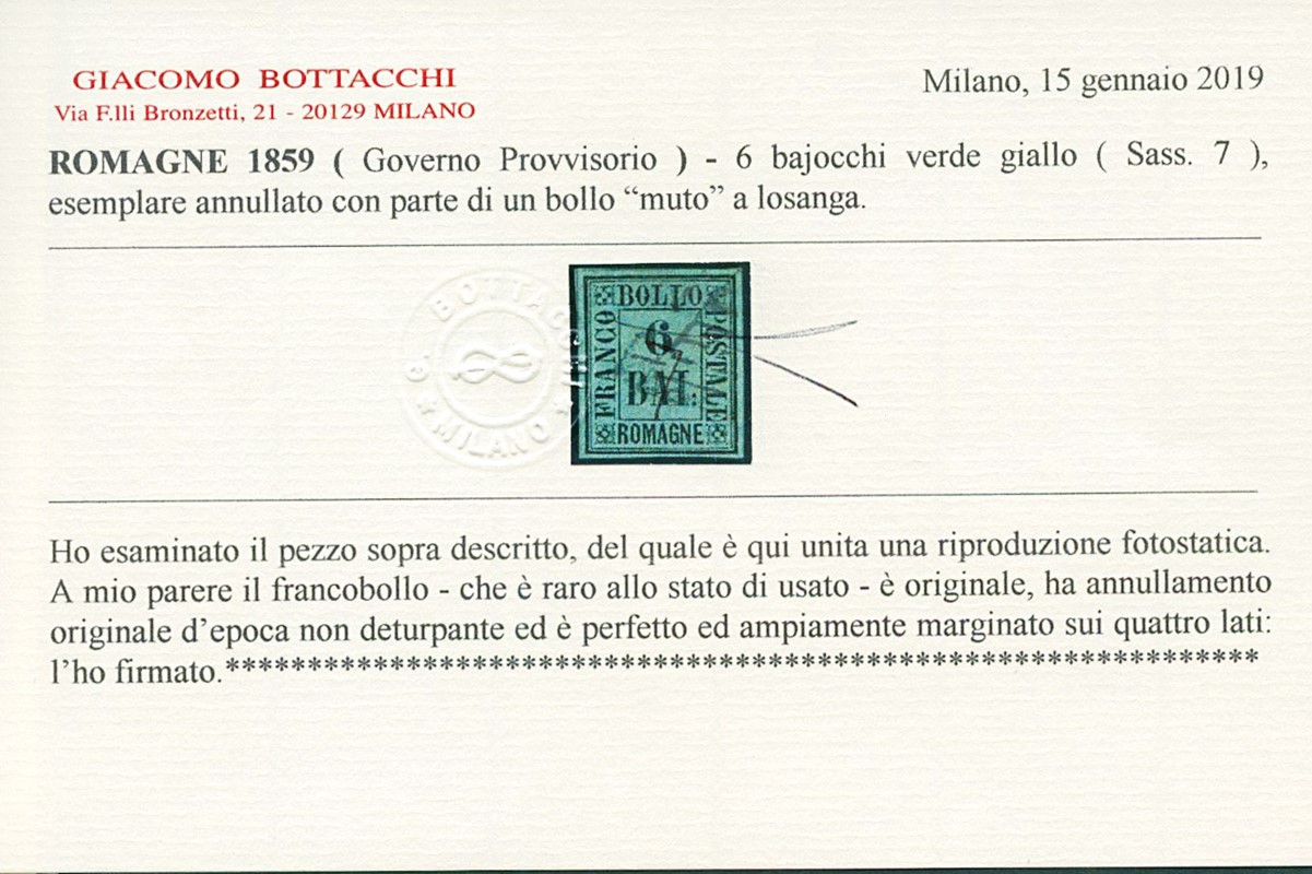1859 - 6b verde giallo con grandi margini, annullato con muto a griglia. Raro. Firma G.Oliva, CF A.Diena e Bottacchi (Sassone 7 - Euro 16.000+)