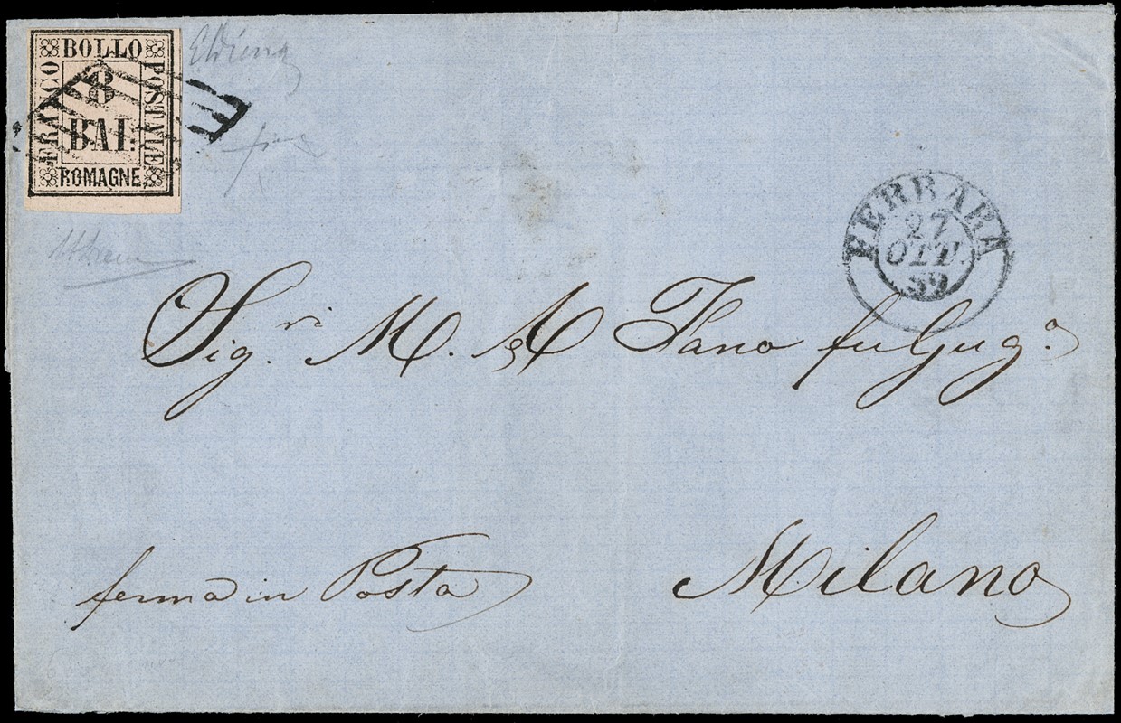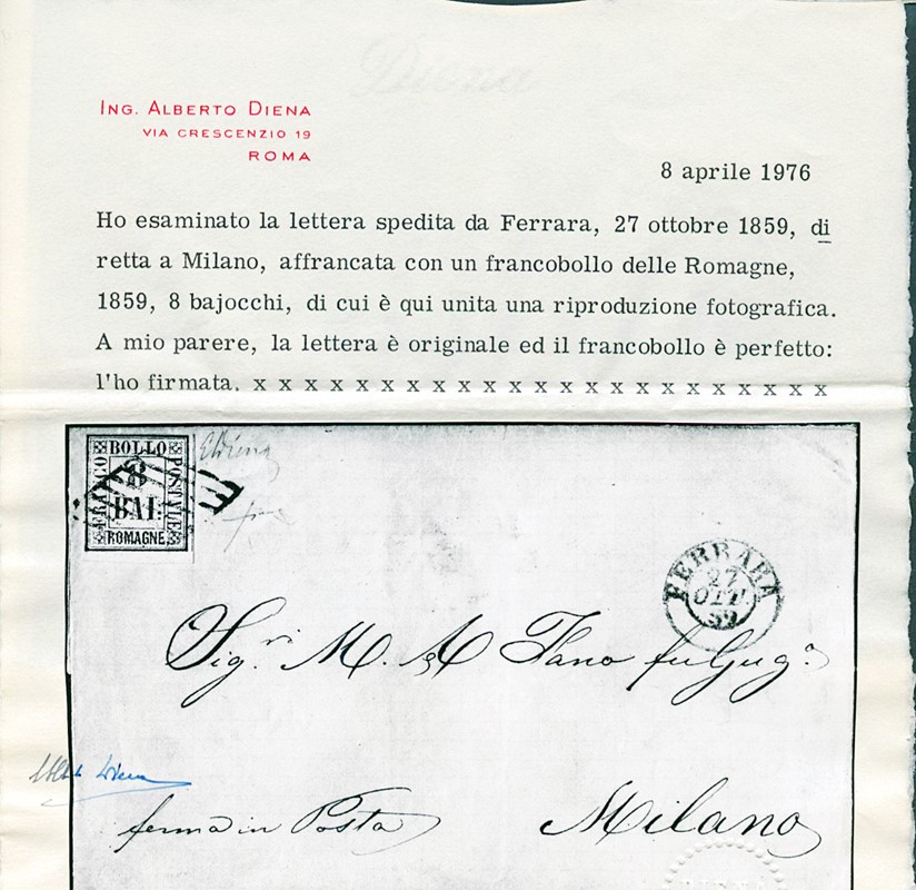 1859 - 8b rosa, BdF in basso, da 'FERRARA 27 OTT 59' a Milano. Splendido. Firme Em.Diena, Fiecchi e CF A.Diena (Sassone 8 - Euro 35.000)