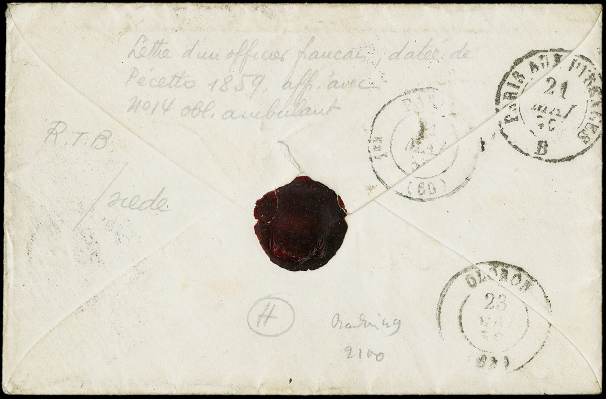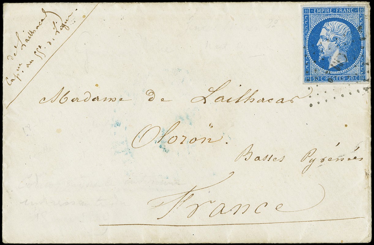 1859 - Francia 20c azzurro Napoleone III annullato con bollo a punti dell'ambulante 'MC-M' (Mont Cenis - Maçon), su lettera per posta civile scritta da un militare francese a 'Pecetto pre's de Valenza 18 mai 1859' per Oloron, con interessantissimo testo di tre pagine. Rara, ex. collezione Dubus (Yvert 14 - Euro -)