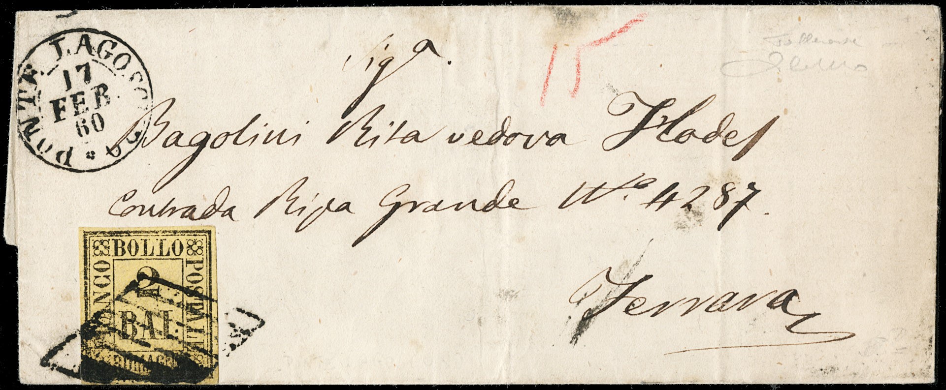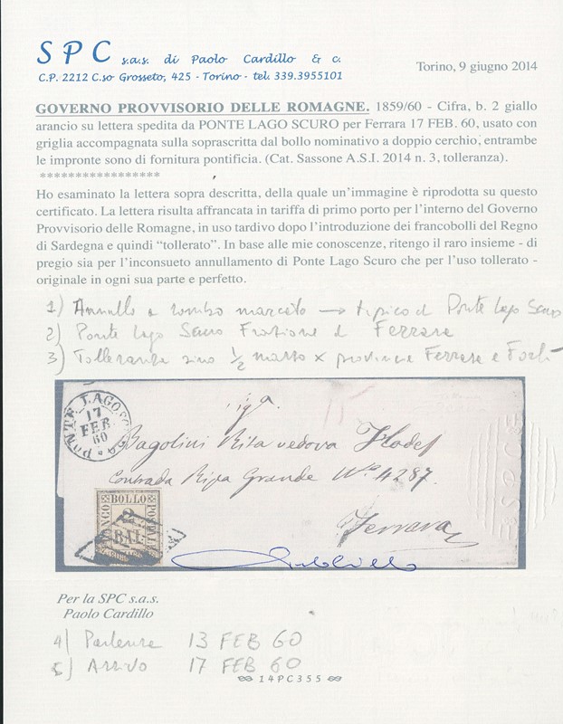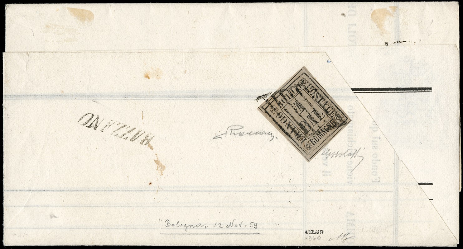1859 - insieme di tre lettere affrancate con 1b grigio, 2b giallo arancio usato in periodo di tolleranza, e 4b fulvo. Insieme interessante di ottima qualita', 1 CF (Sassone 2, 3, 5 - Euro - )
