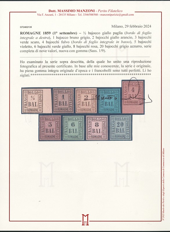 1859 - la serie completa di nove valori, nuovi con gomma integra. Insieme di ottima qualita'. Sigla G.Bolaffi e CF Manzoni (Sassone 1/9 - Euro 9.000)