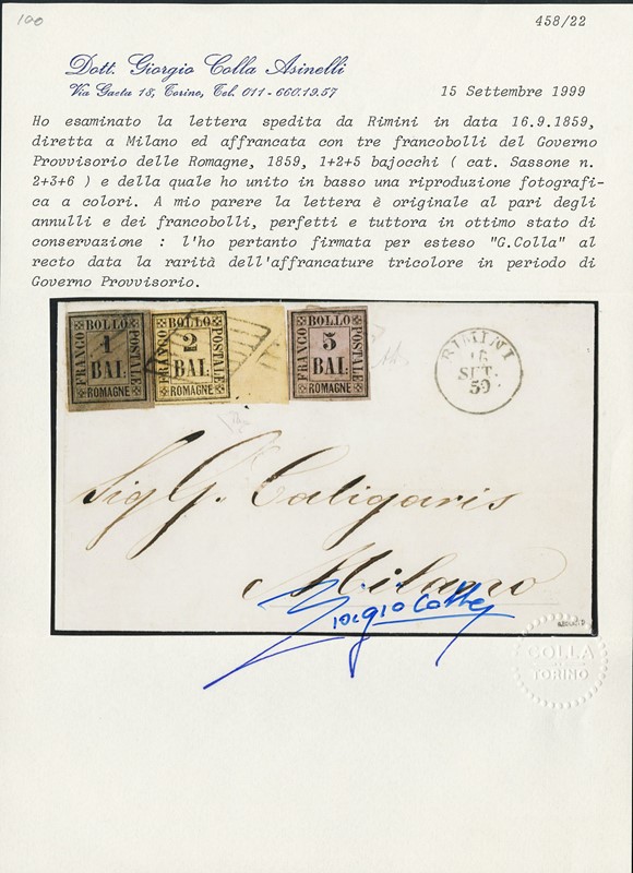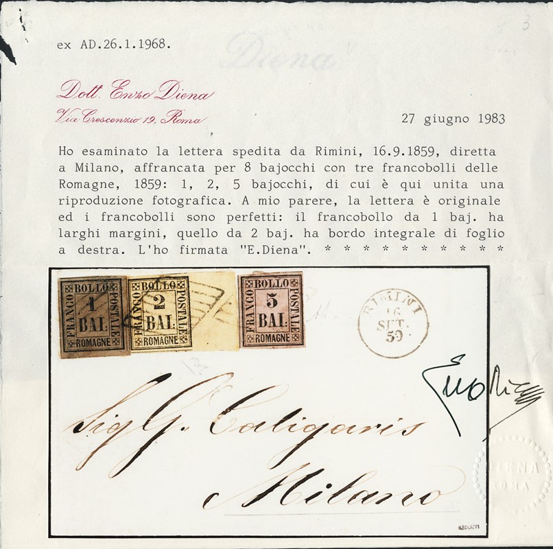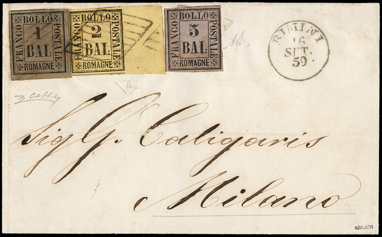 1859 - Romagne, 1b bruno grigio e 2b giallo arancio con BDF integrale a destra e 5b violetto, affrancatura tricolore da 'RIMINI 16 SET. 59' a Milano. Splendida, grande rarita'. Sigla A.Diena, CF Colla ed E.Diena (Sassone 2+3+6 - Euro 75.000)