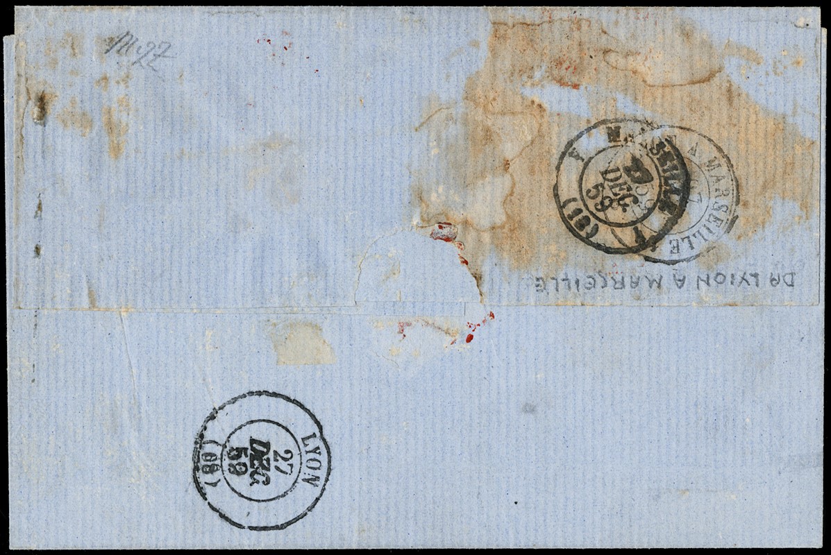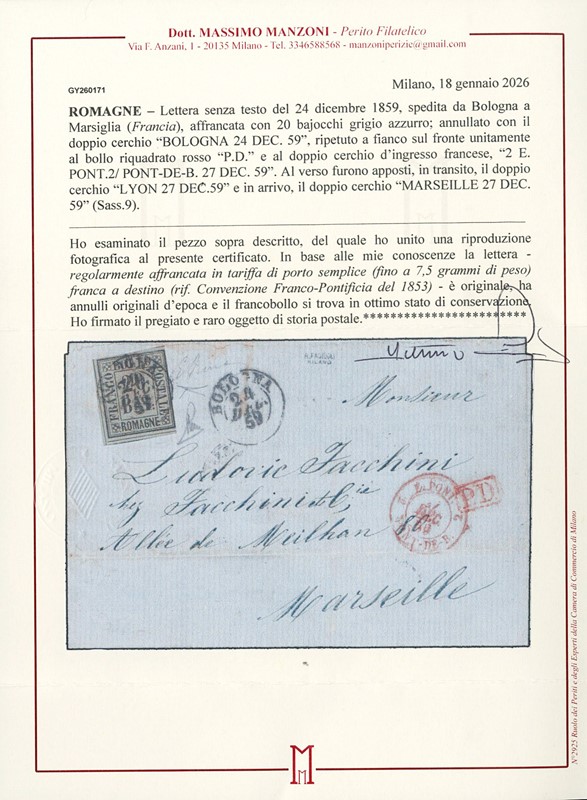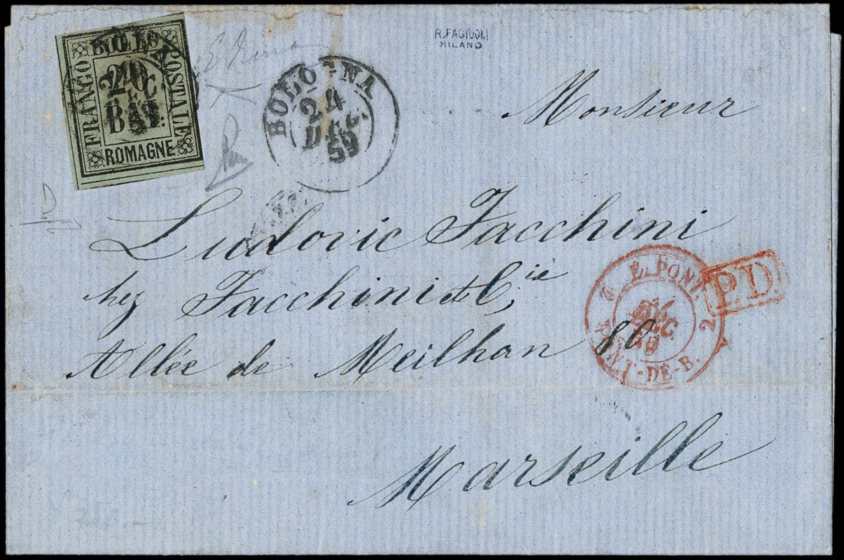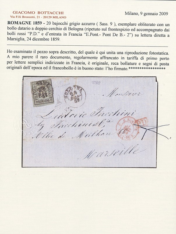 1859 - Romagne, 20b grigio azzurro, appena a filo a destra, comunque perfetto, da 'BOLOGNA 24 DEC. 59' a Marsiglia. Rara. Firme Em.Diena e Salvatore Palermo, CF Bottacchi e Manzoni (Sassone 9 - Euro 50.000)