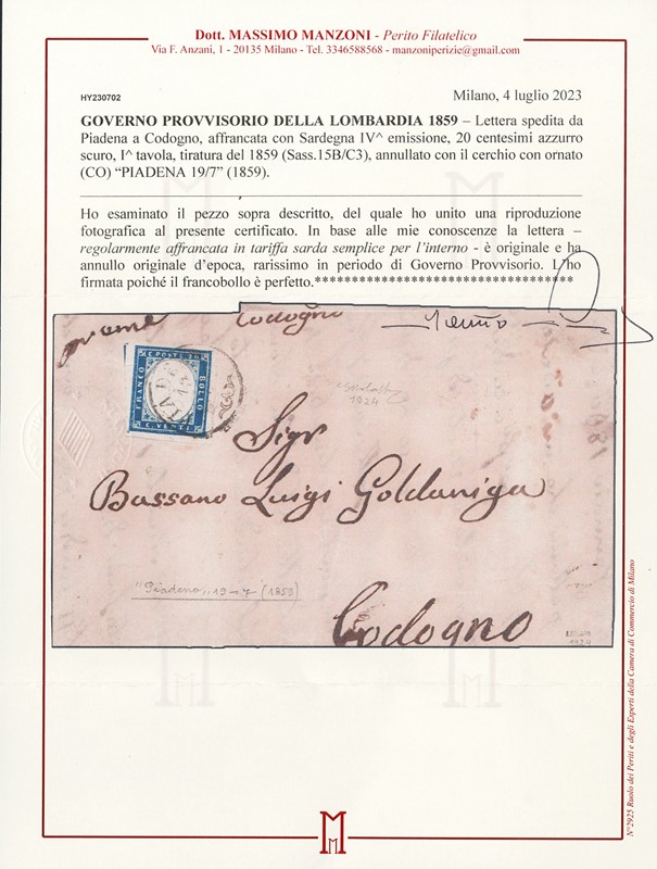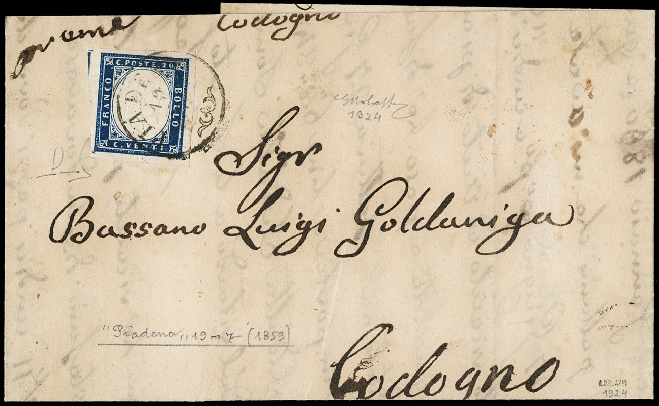 1859 - Sardegna 20c azzurro da 'PIADENA 19/7' a Codogno. Firma Giulio Bolaffi, CF Manzoni (Sassone C3+pt.R1 - Euro 22.500)