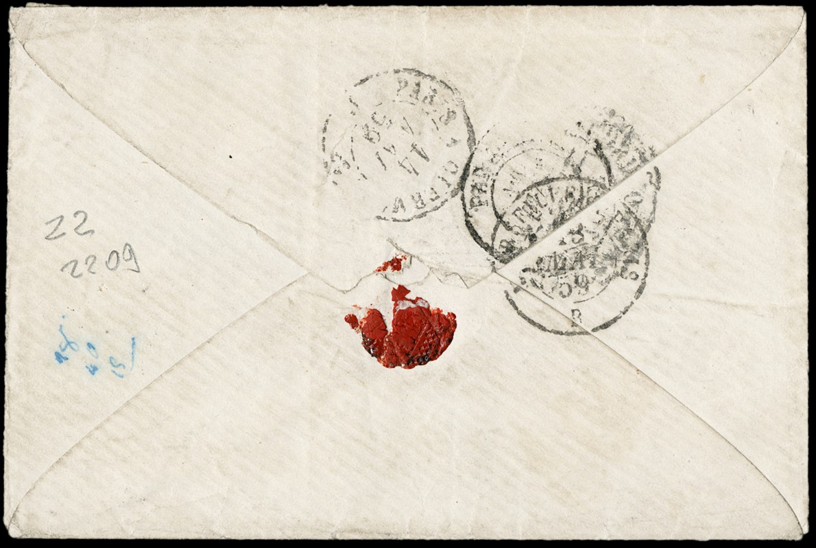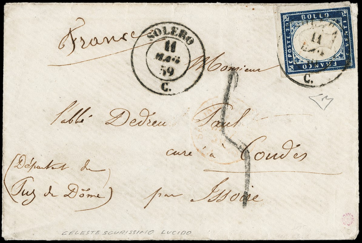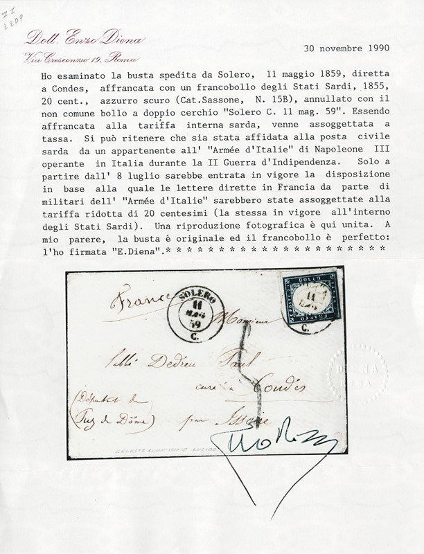 1859 - Sardegna: 20c azzurro scuro, I tavola tir.59, da 'SOLERO 11 MAG. 59' a Condes. Rarissima prima data nota per l'uso di un francobollo sardo da parte dei militari francesi, in tariffa ridotta per posta civile, durante la Campagna sardo-francese del 1859. La lettera fu tassata in arrivo in quanto solamente a partire dall'8 luglio sarebbe entrata in vigore la disposizione in base alla quale le lettere dirette in Francia da parte dei militari francesi sarebbero state assoggettate alla tariffa ridotta di 20 centesimi. Dettagliato CF E.Diena (Sassone 15B - Euro -)