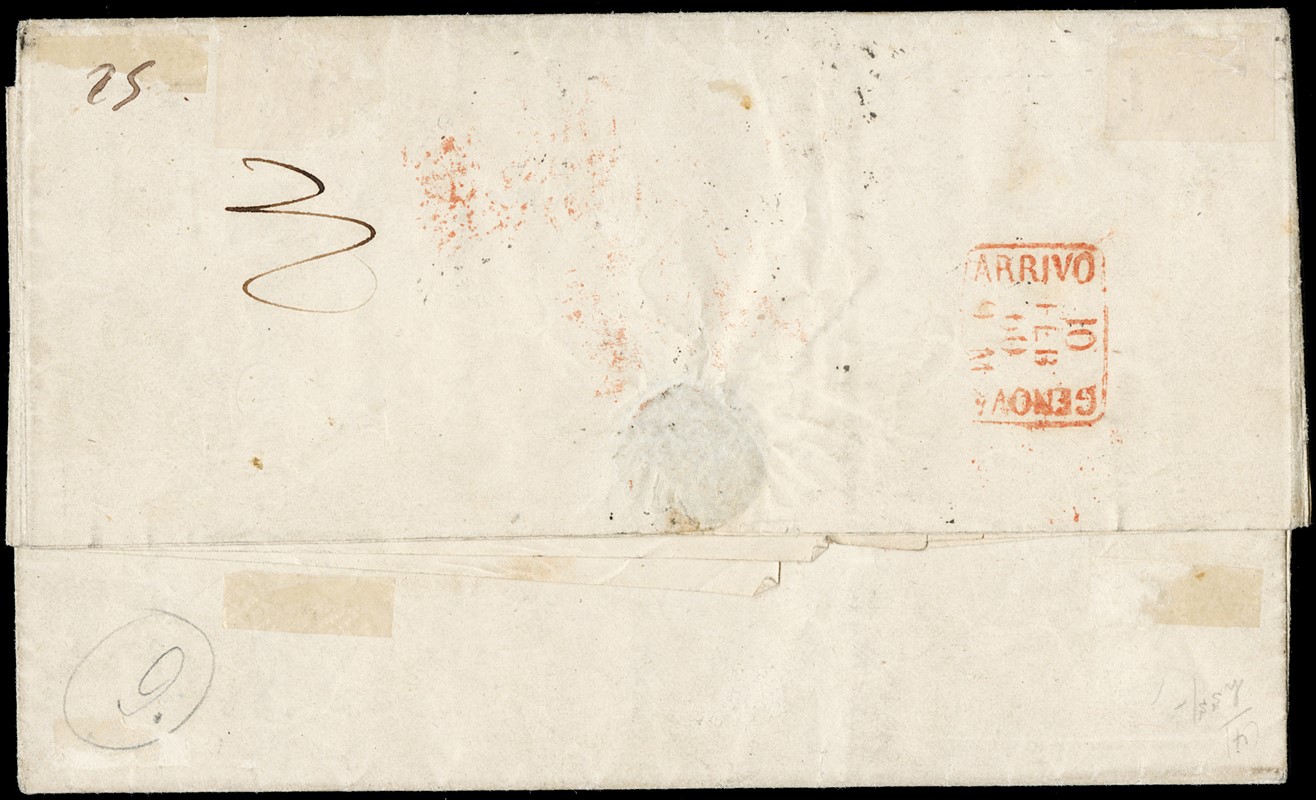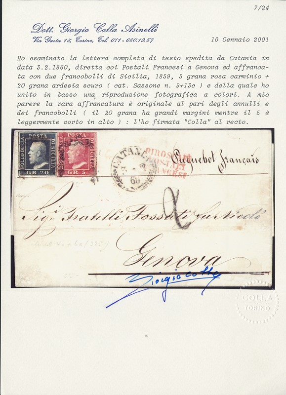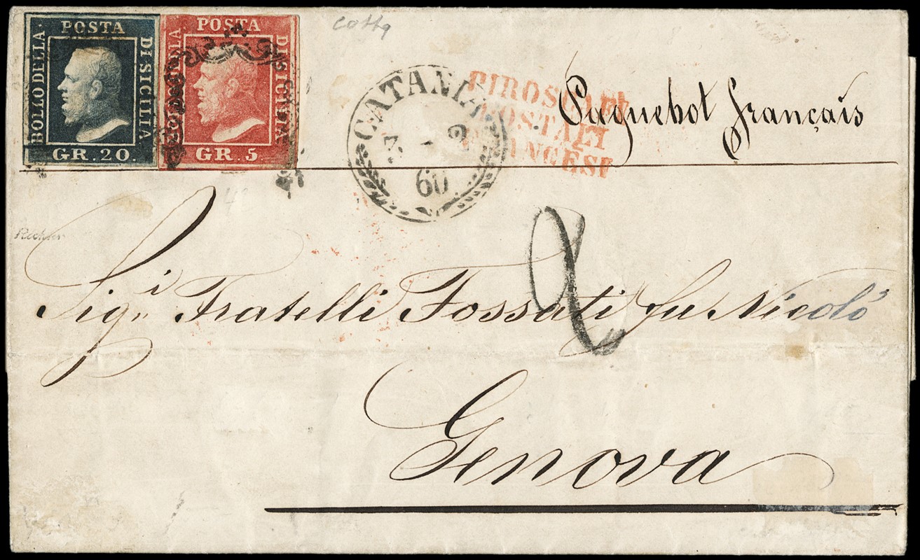 1859 - Sicilia, 5gr rosa carminio, I tav, leggermente corto in alto, e 20gr ardesia scuro da 'CATANIA 3 FEBBRAIO 1860' a Genova coi 'PIROSCAFI POSTALI FRANCESI' (in rosso). Pregiata e rara affrancatura da 25 gr per il Regno di Sardegna con i Postali Francesi da Catania. CF Colla (9+13c - Euro 27.500)