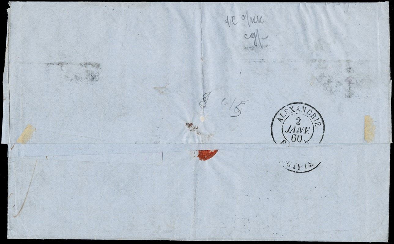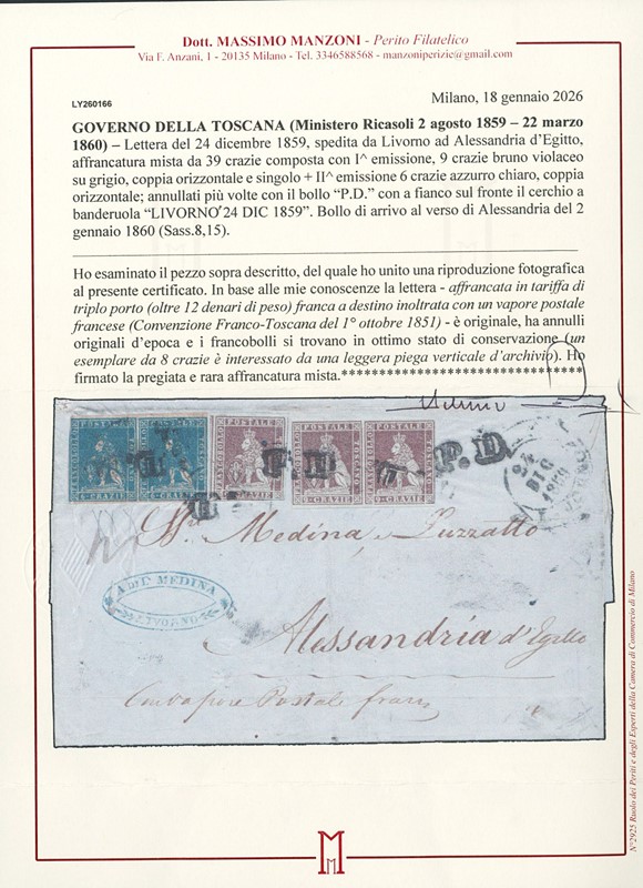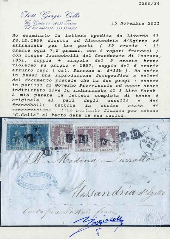 1859 - Toscana, 9cr bruno violaceo su grigio, coppia orizzontale e singolo e 6cr azzurro cupo, coppia orizzontale, da 'LIVORNO 24 DICEMBRE 1859' ad Alessandria d'Egitto. Affrancatura mista I e II emissione in periodo di Governo Provvisorio. Qualche difetto, oggetto postale comunque di grande fascino e rarita' sia per la destinazione, sia per l'affrancatura. CF Colla e Manzoni (Sassone 8+15b - Euro - )