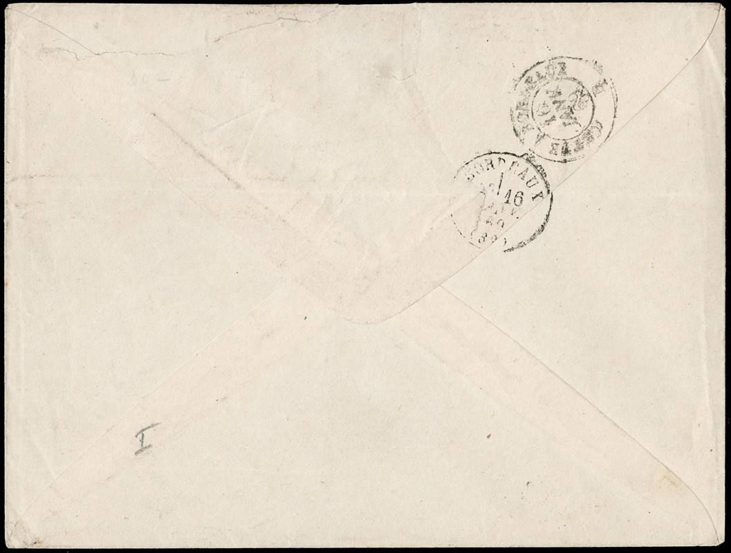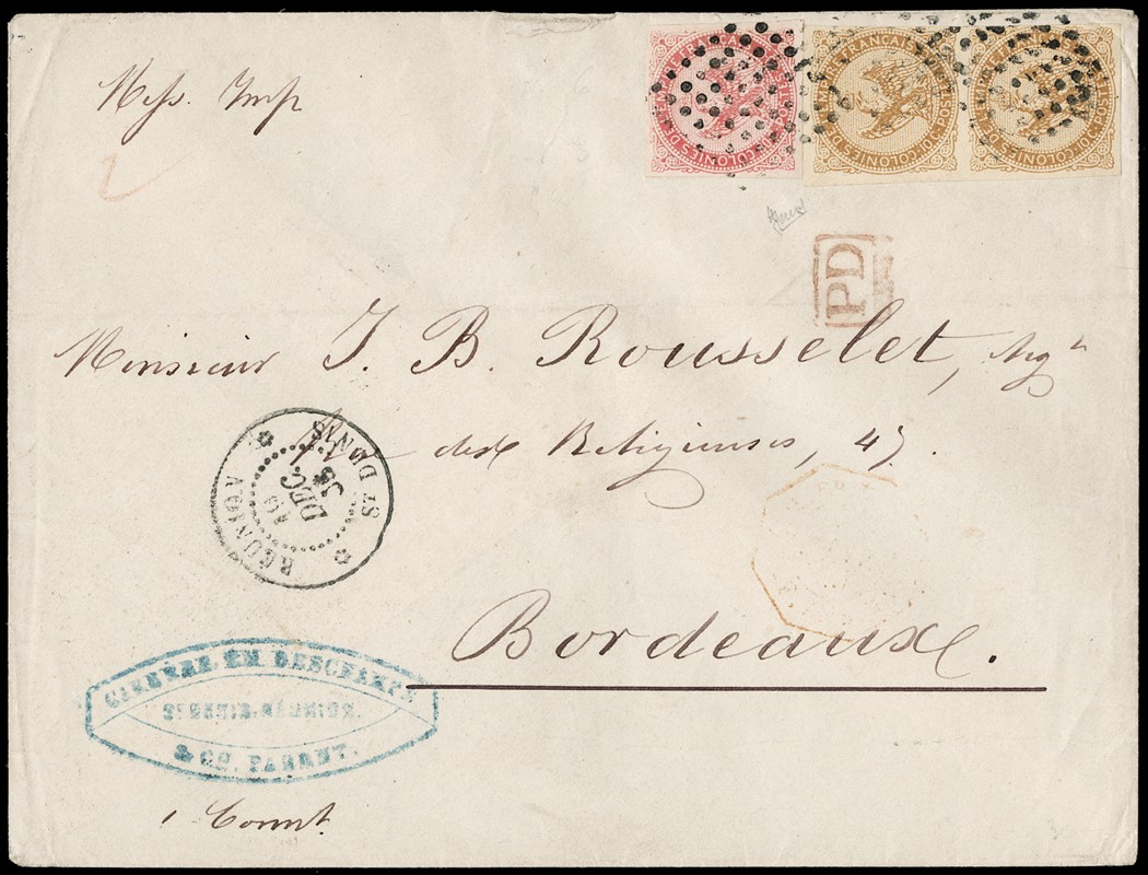 1859/65 - REUNION: Aquilette 10c bistro giallo, coppia, e 80c rosa, tutti con grandi margini bianchi, su lettera di doppio porto da 'REUNION ST. DENIS 10 DEC 68' per Bordeaux (Yvert 3+6 - Euro -)