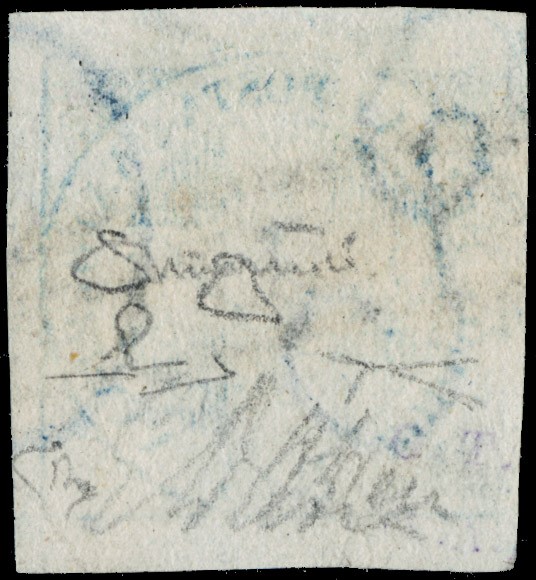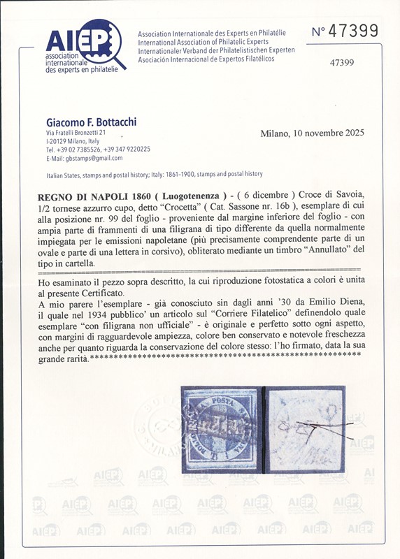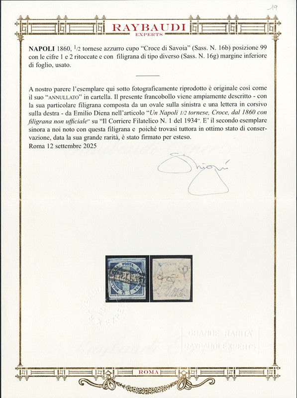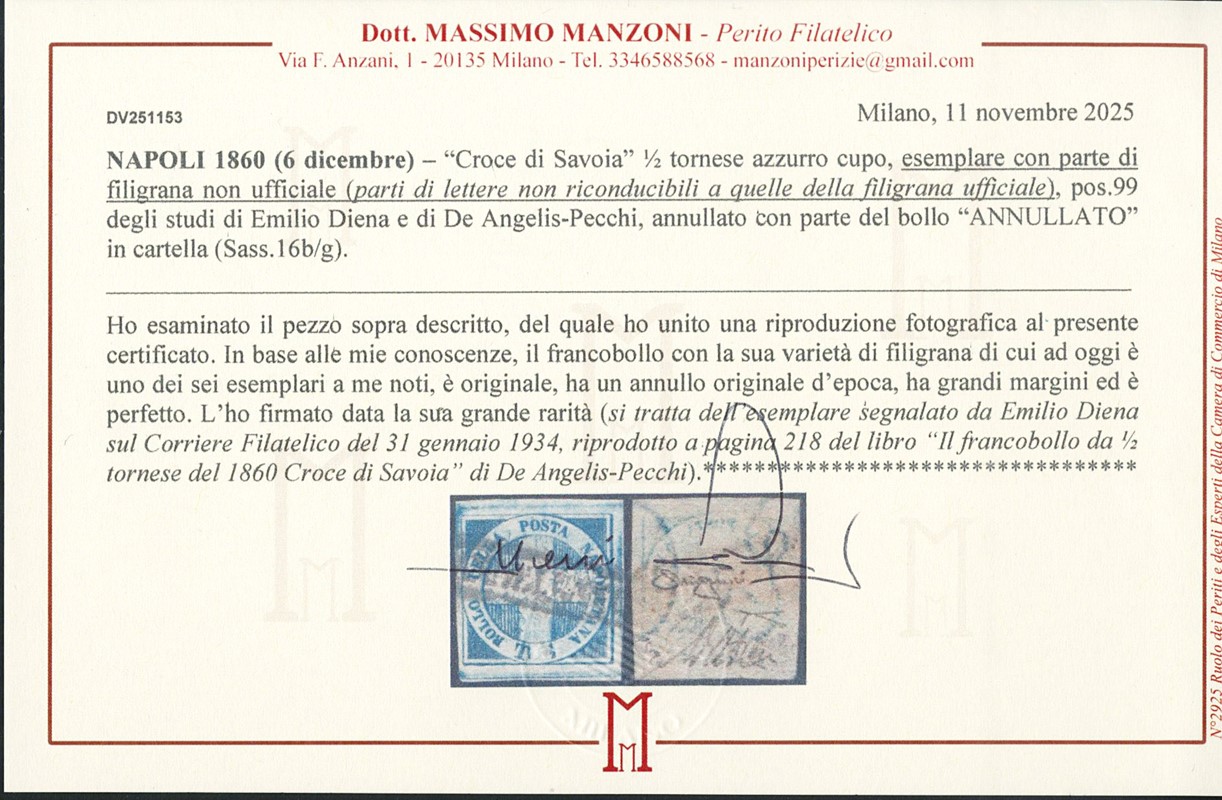 1860 - 1/2t azzurro cupo 'Crocetta', esemplare BdF inferiore con parti di filigrana di tipo diverso. Raro, CF Bottacchi AIEP, Manzoni e Raybaudi (Sassone 16b/g - Euro 38.500)