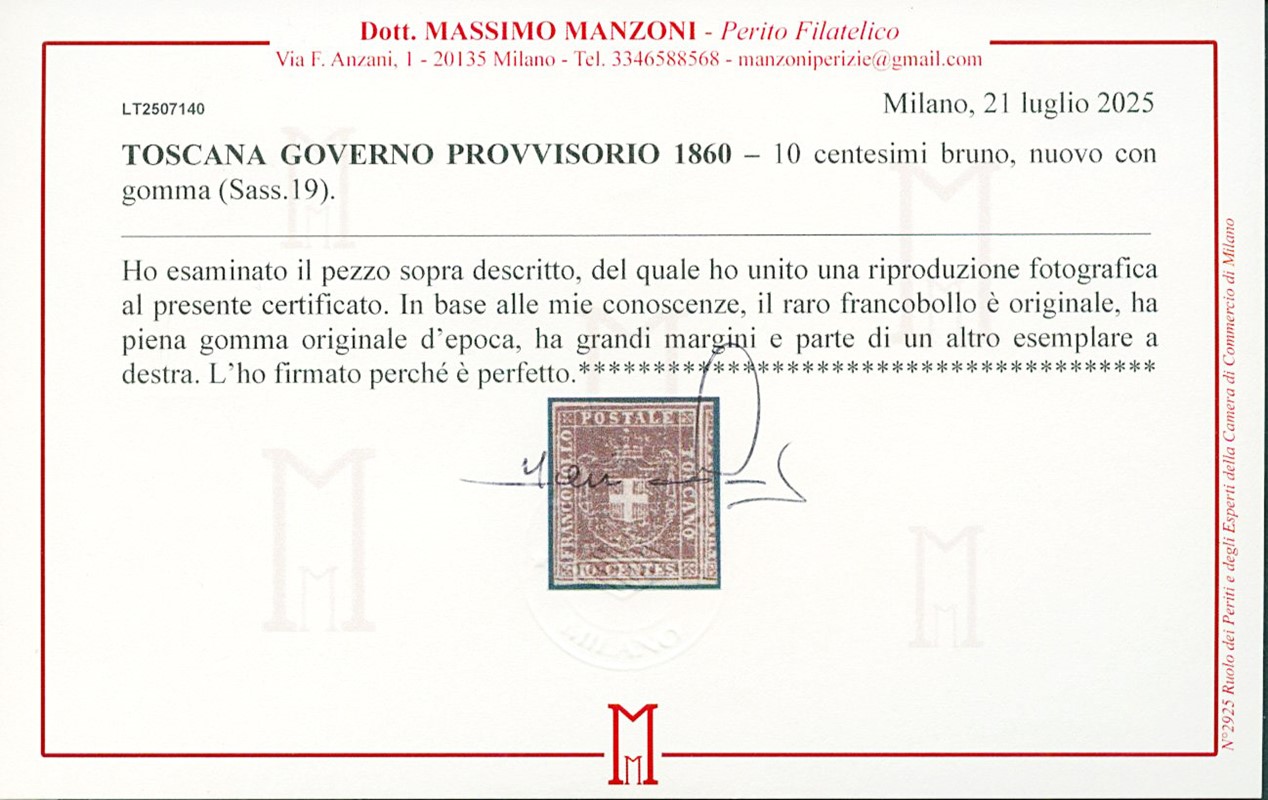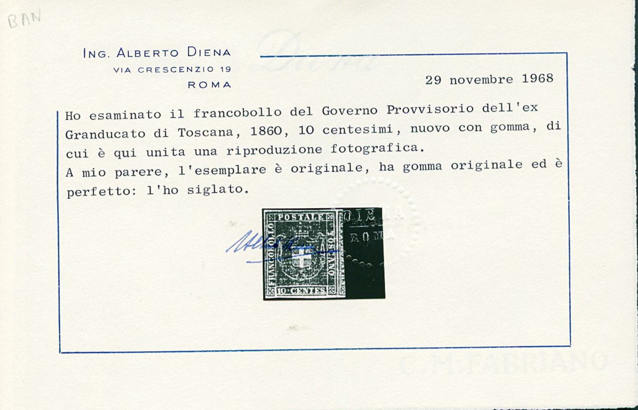 1860 - 10c bruno con grandi margini, nuovo con piena gomma. Raro. CF A.Diena e Manzoni (Sassone 19 - Euro 12.000)