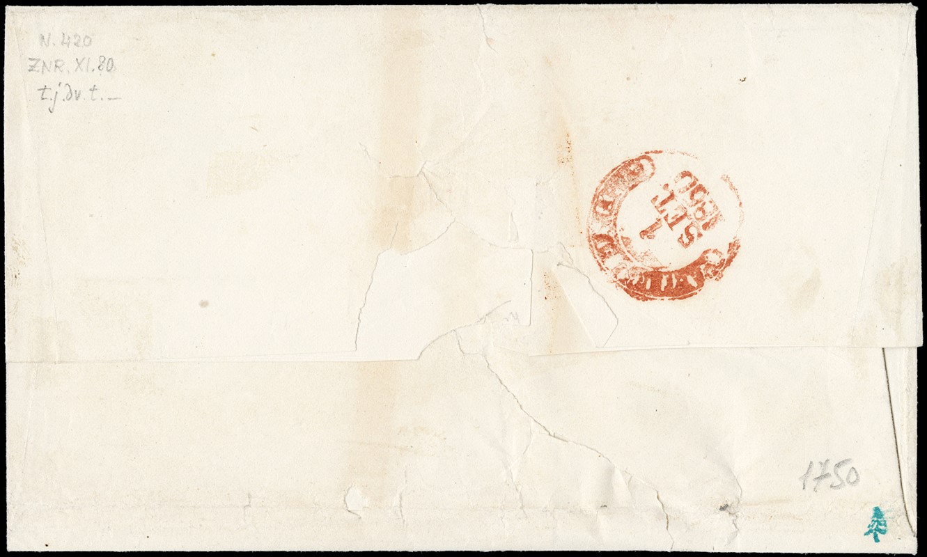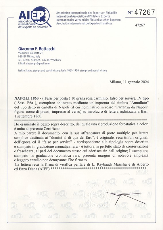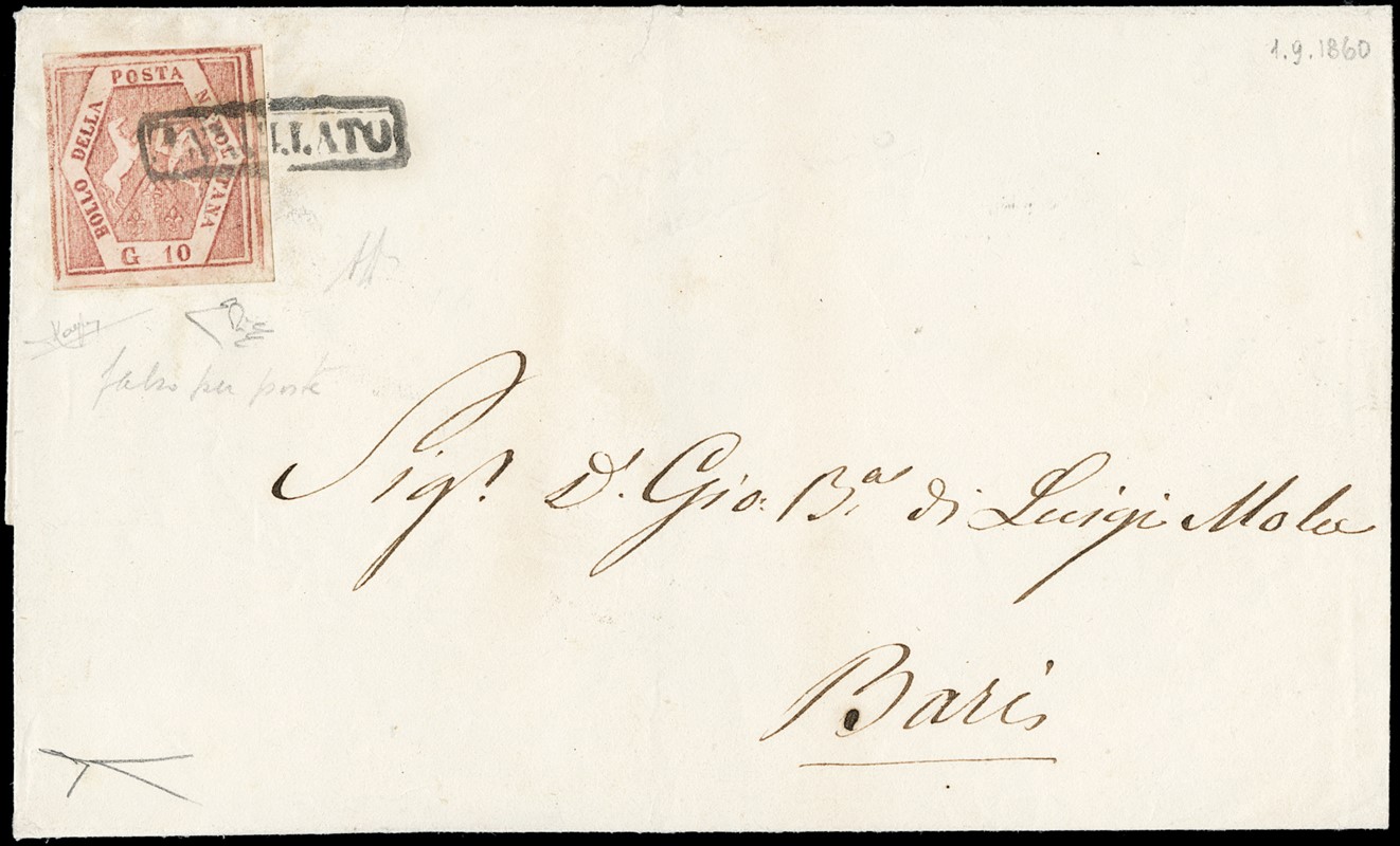 1860 - 10gr rosa carminio, imitazione per frodare la posta IV tipo, 'ANNULLATO' su lettera da Napoli per Bari, 1 settembre 1860. CF E.Diena e Bottacchi AIEP (Sassone F6a - Euro 32.500)